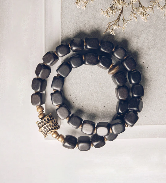 Bakır ve küp abanoz ağacı boncuğundan üretilmiştir.