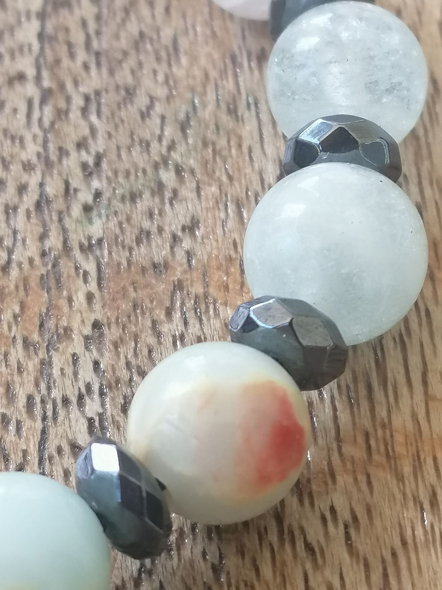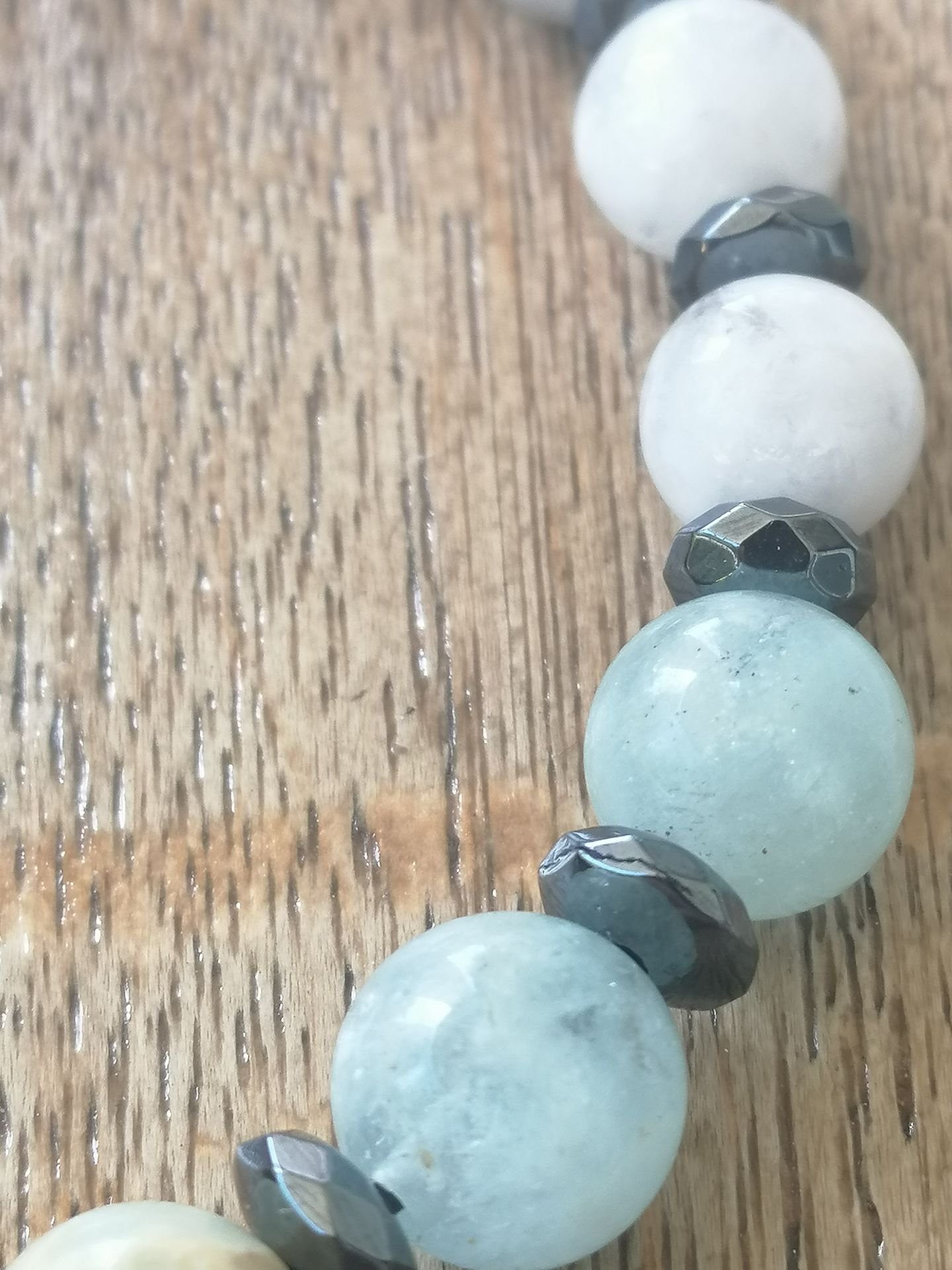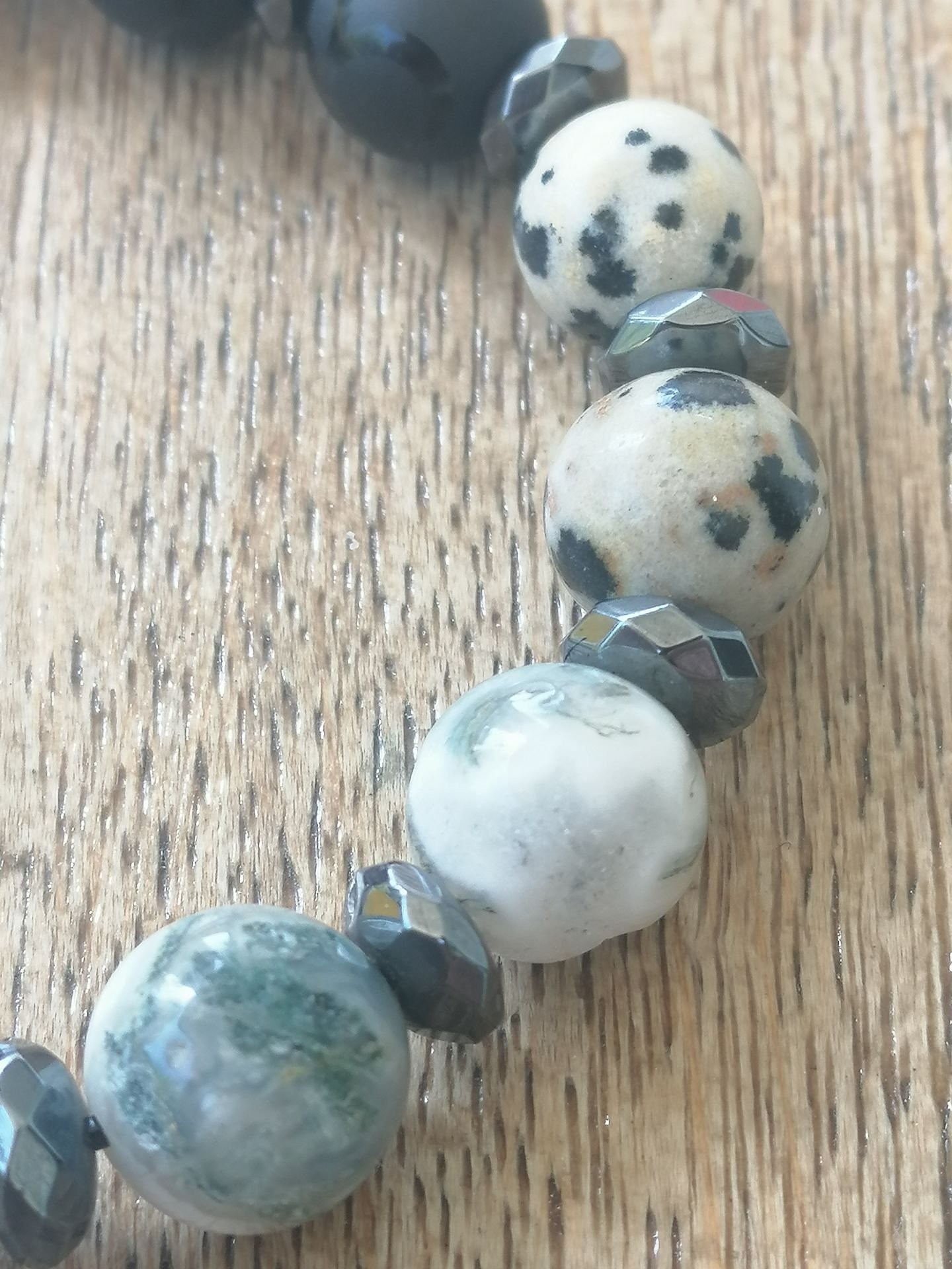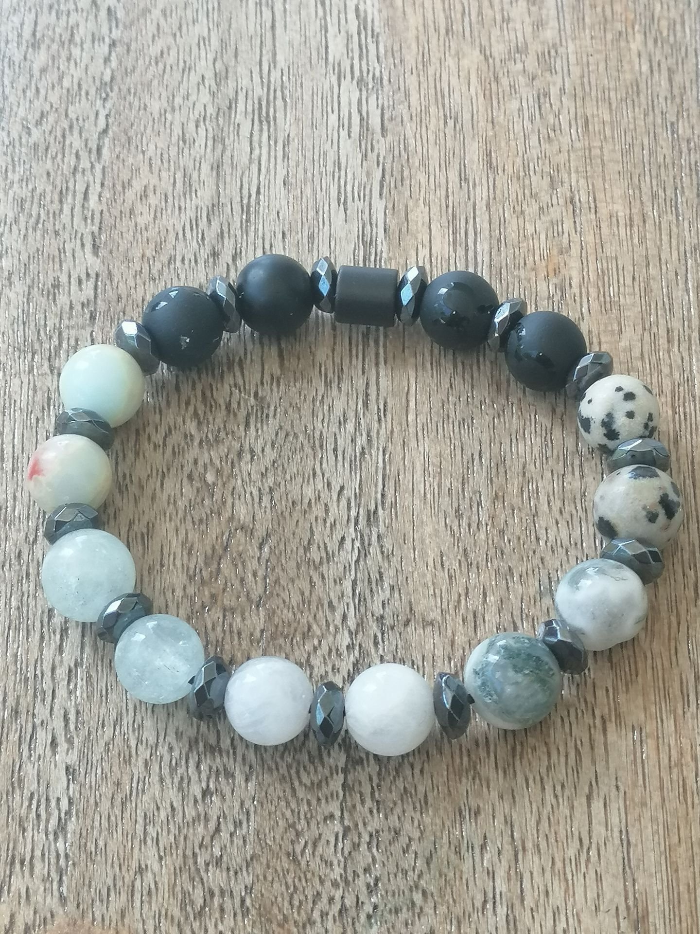 El yapımı, özel tasarım Varisit, Dalmaçyalı, Kan Taşı, Akuamarin, Aytşaı, Oniks ve hematitin güçleri birleştirilerek güçlü ve şık bir bileklik tasarladık. Para ve Bolluk Bereket Bilekliği.