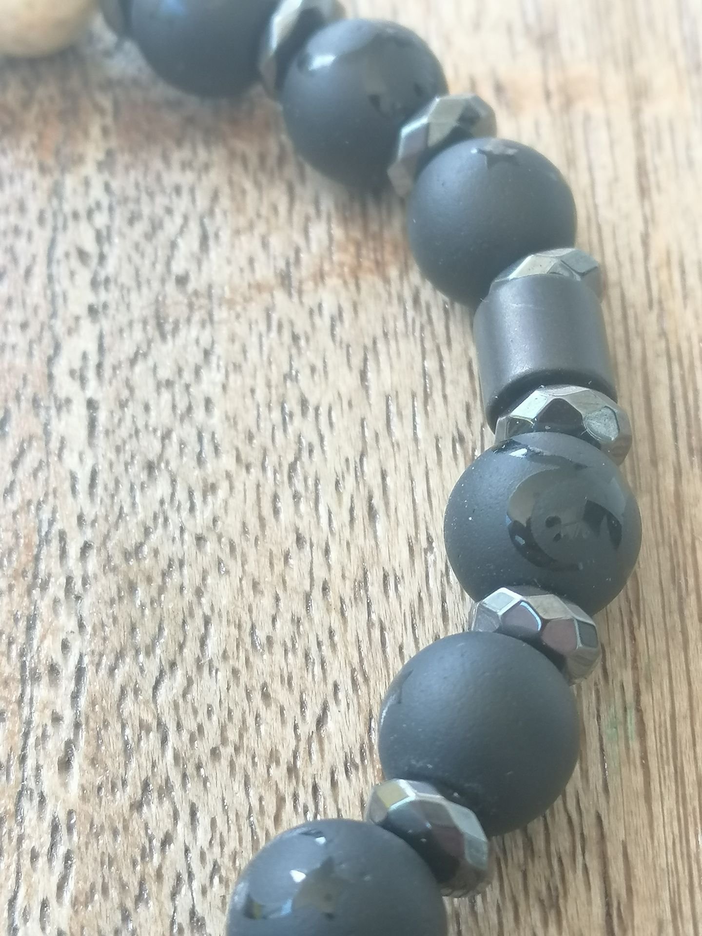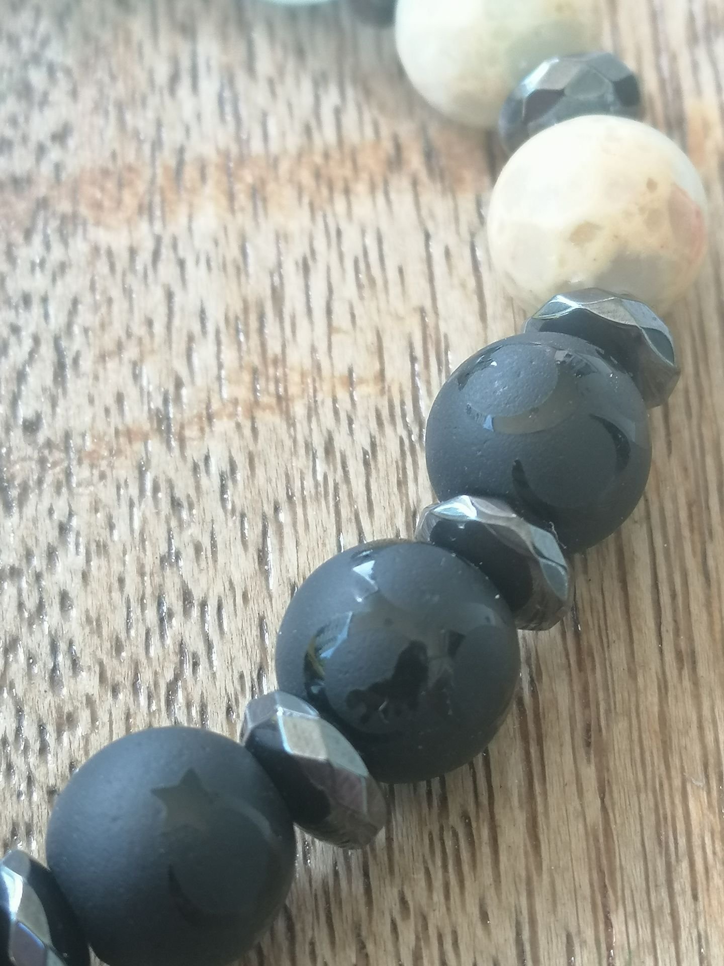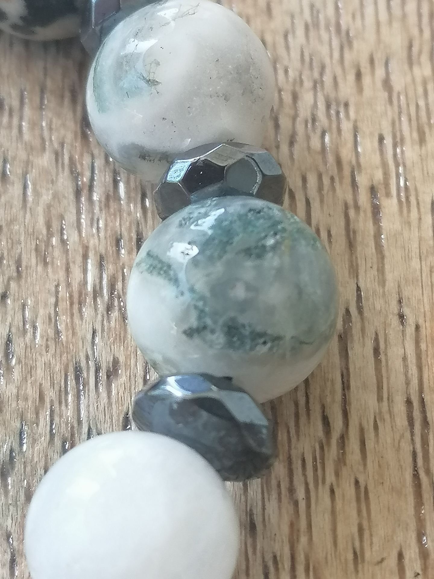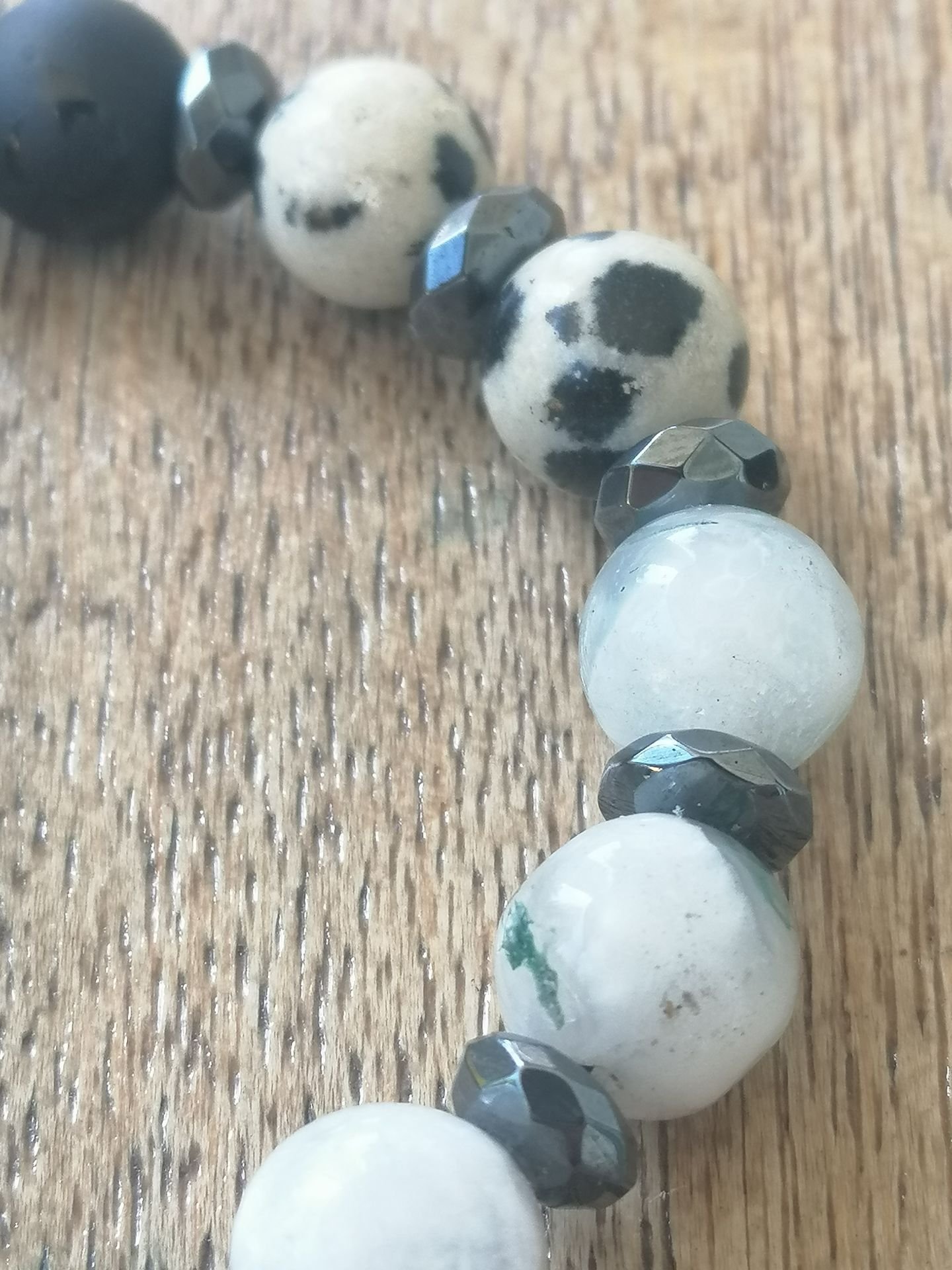 El yapımı, özel tasarım Varisit, Dalmaçyalı, Kan Taşı, Akuamarin, Aytşaı, Oniks ve hematitin güçleri birleştirilerek güçlü ve şık bir bileklik tasarladık. Para ve Bolluk Bereket Bilekliği.