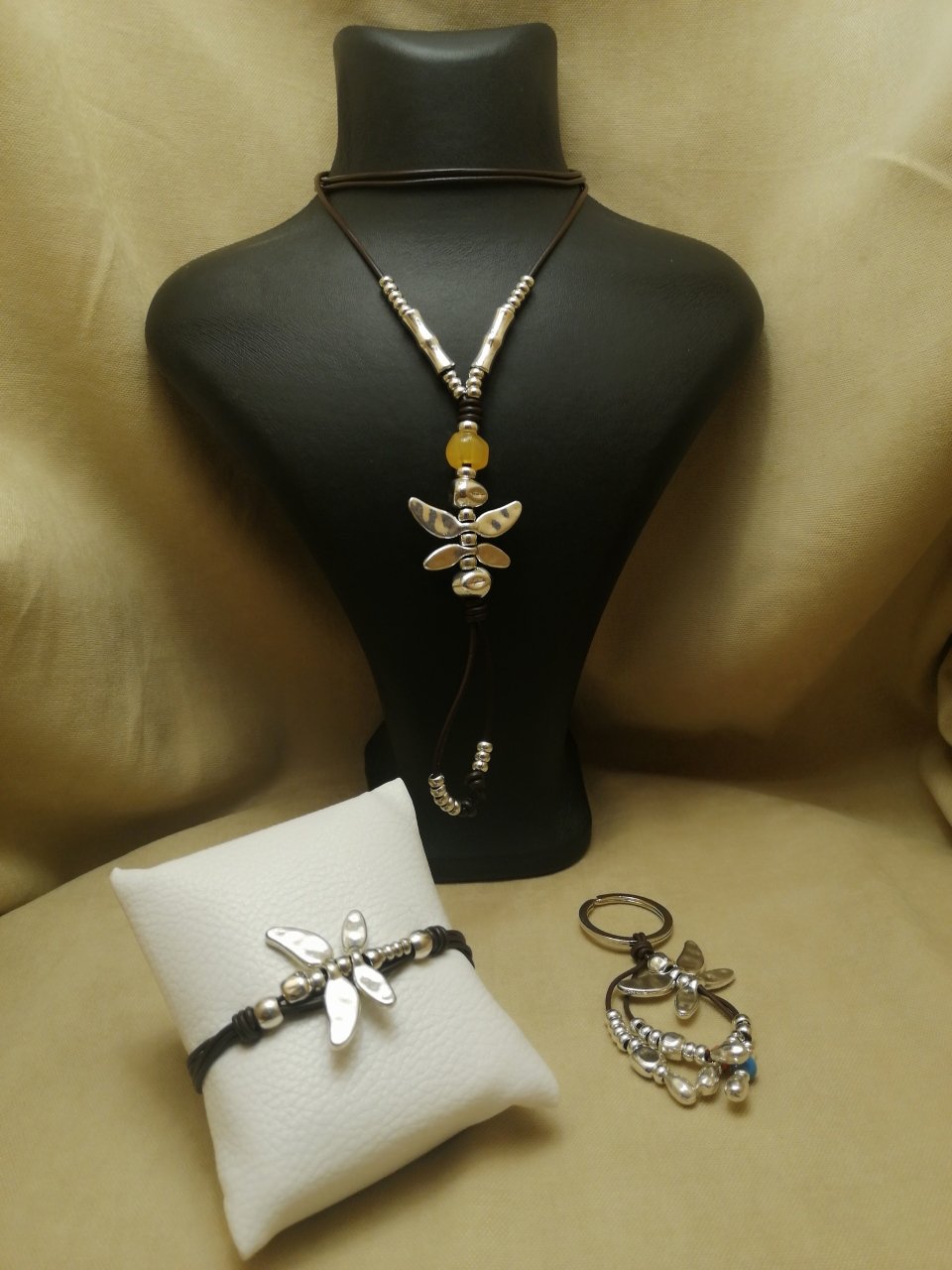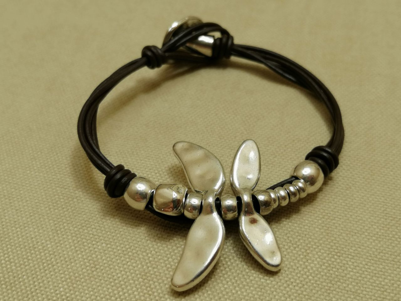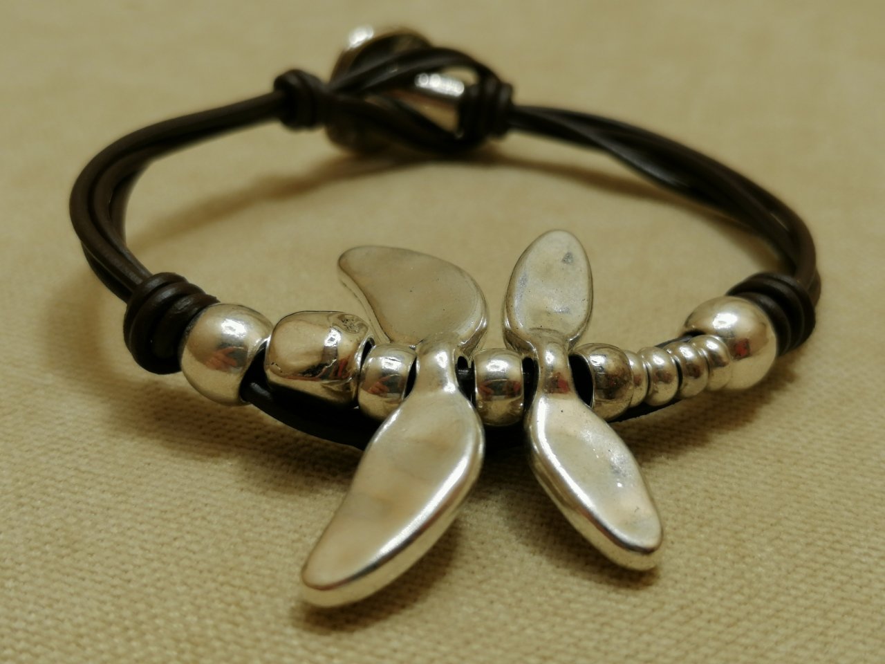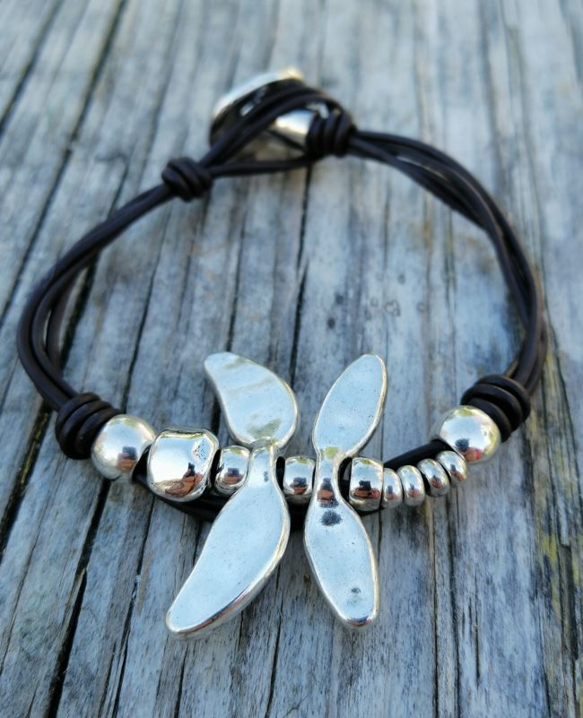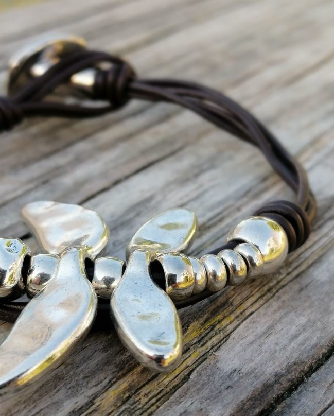 Bilekliğin yapımında deri kordon ve gümüş kaplama aparatlar kullanılmıştır.