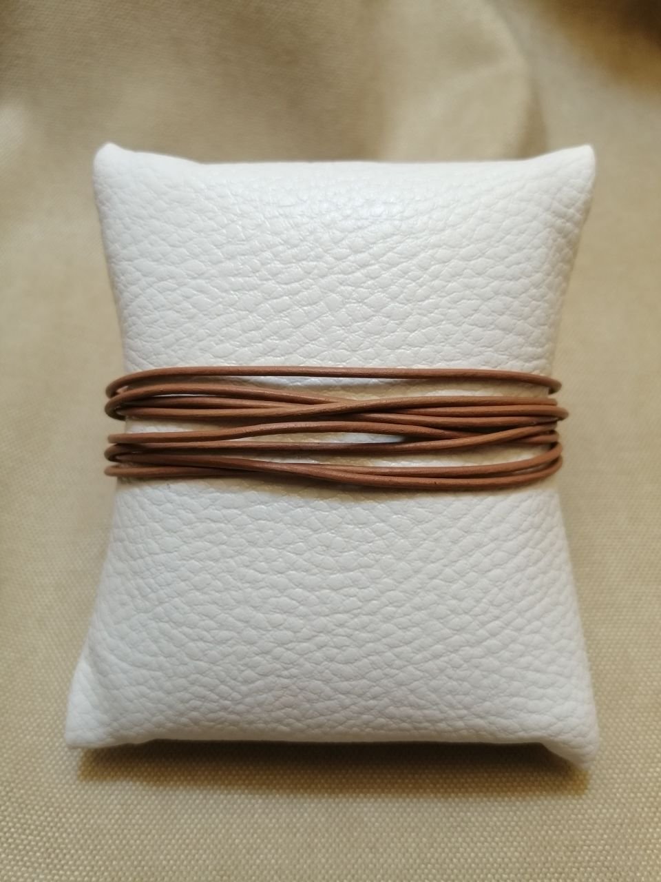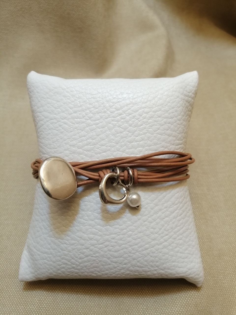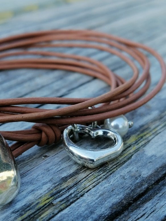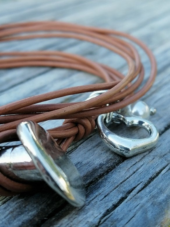 Bilekliğin yapımında deri kordon ve gümüş aparatlar kullanılmıştır.