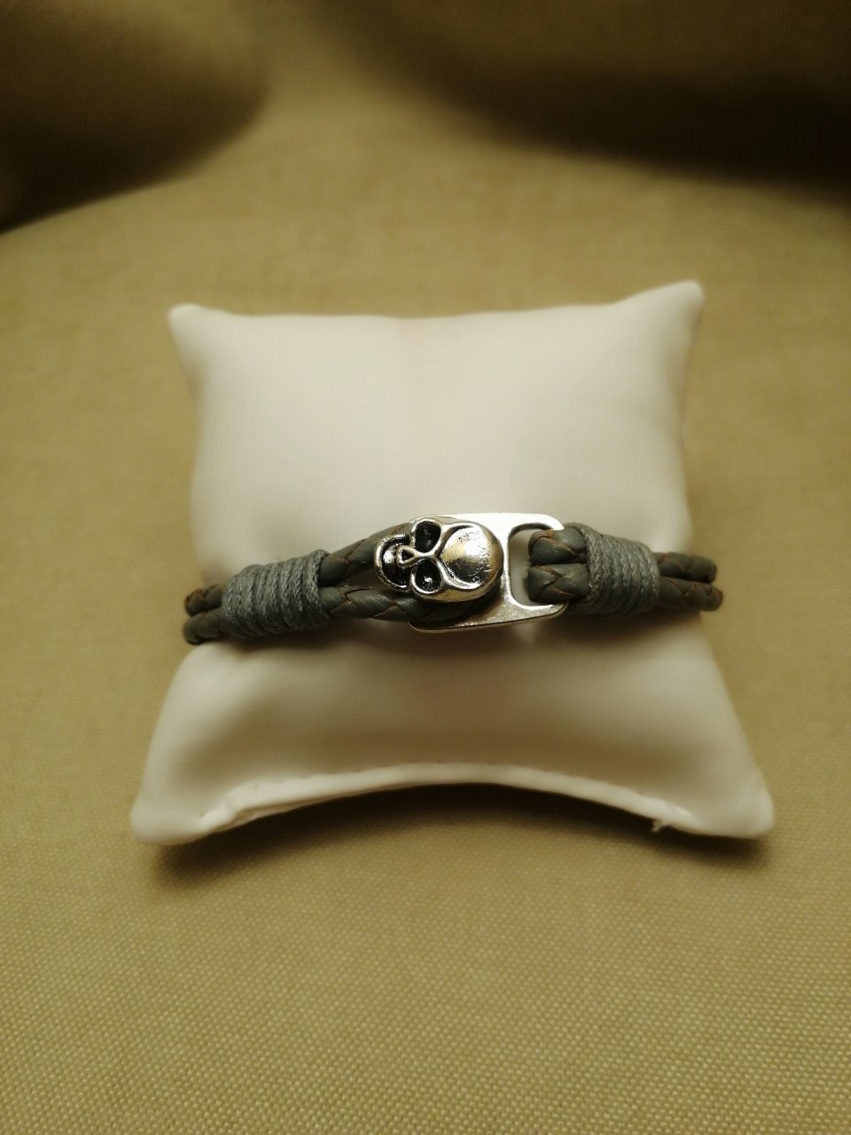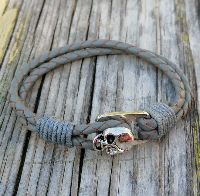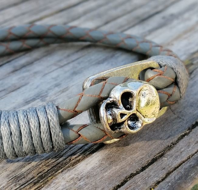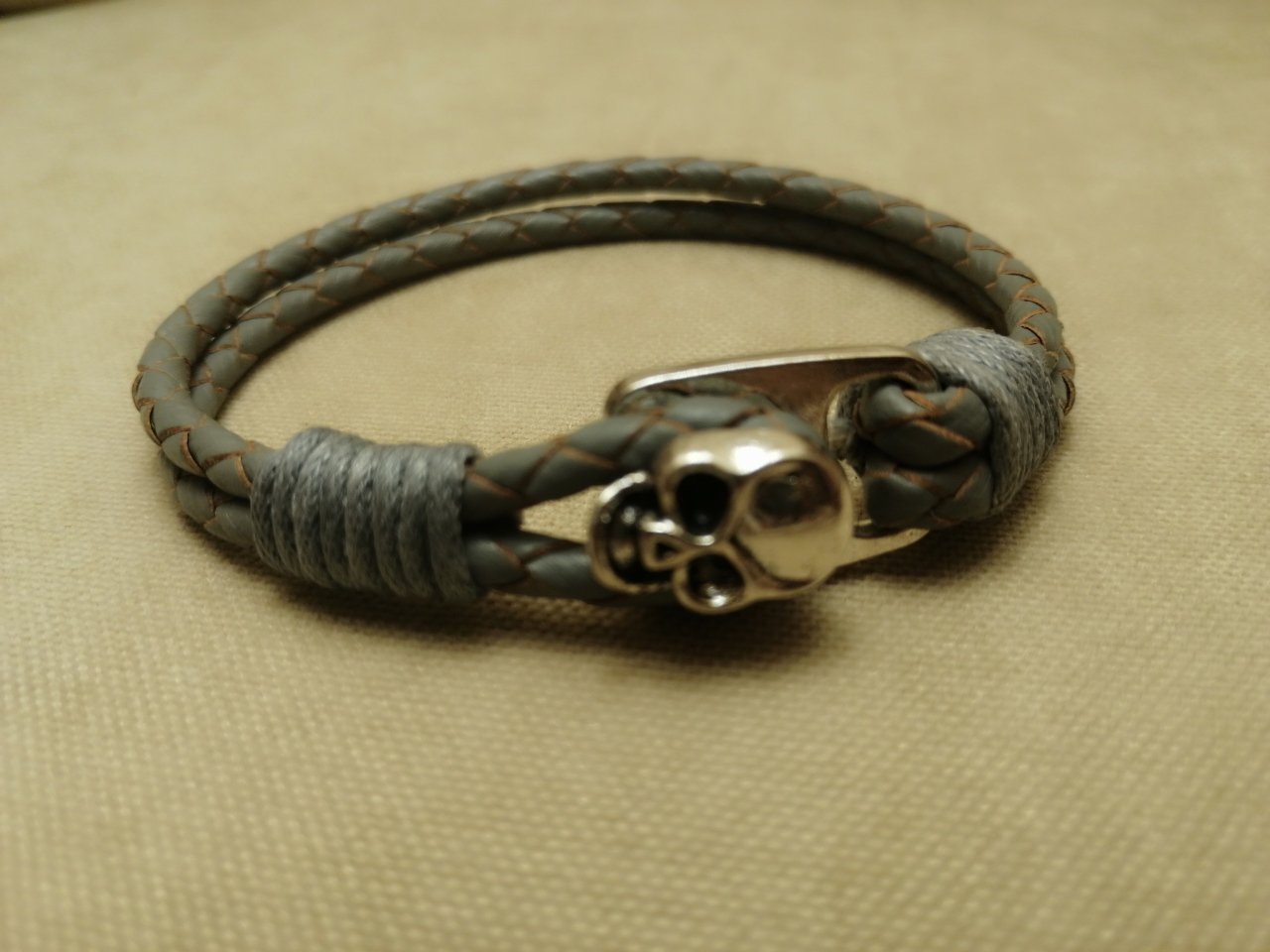 Gümüş Kuru Kafalı Gri Örme Deri Bileklik