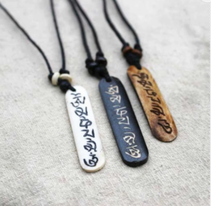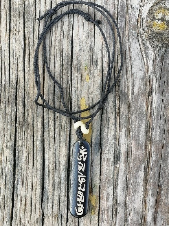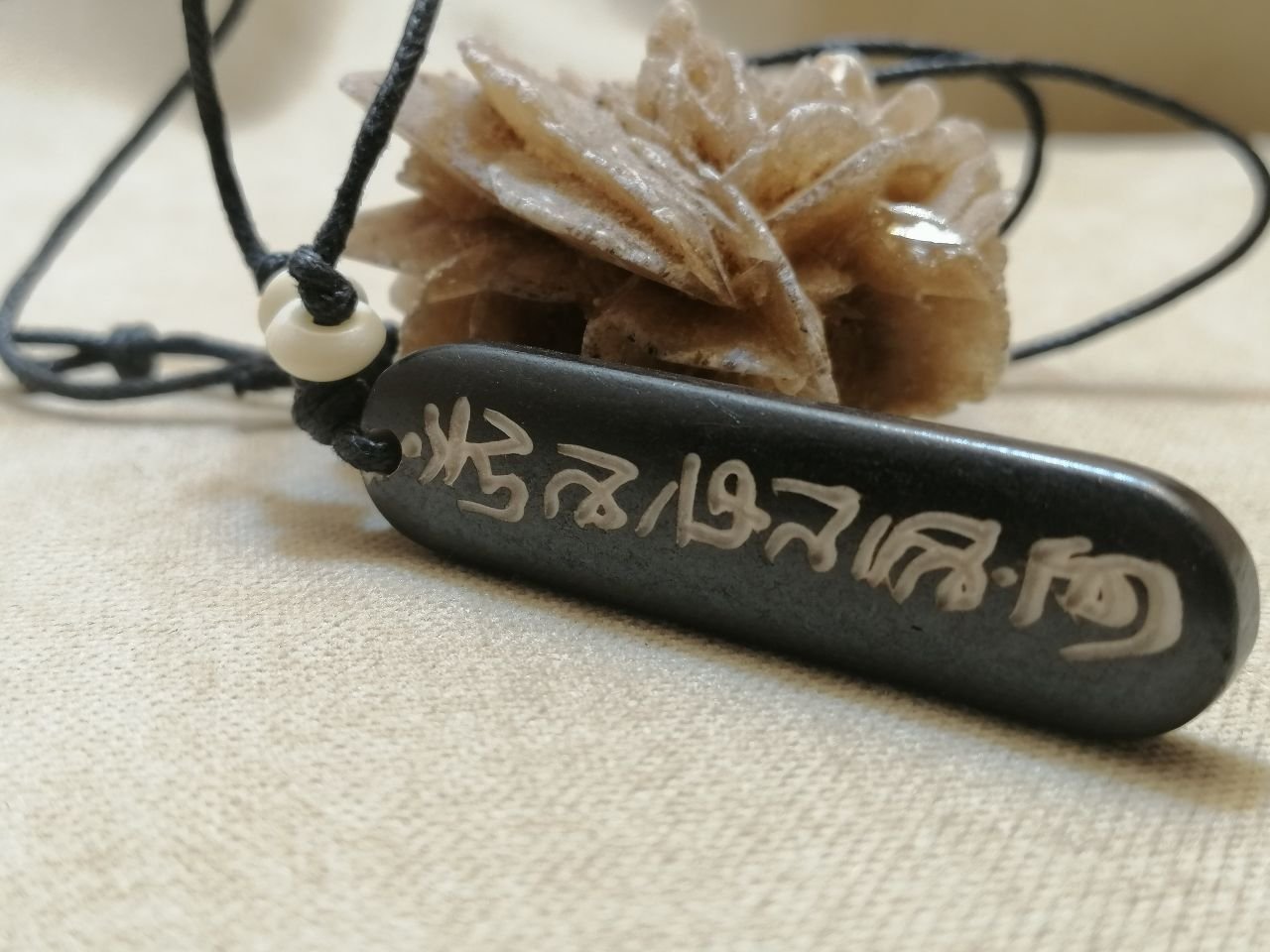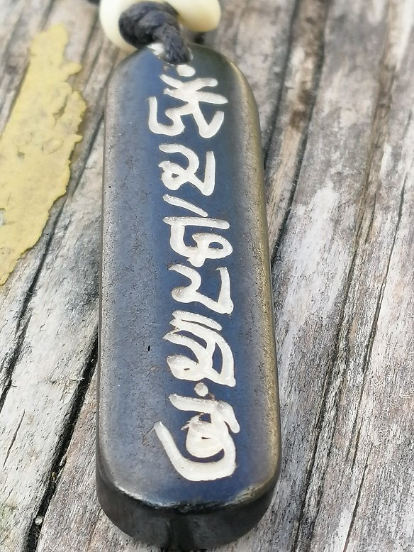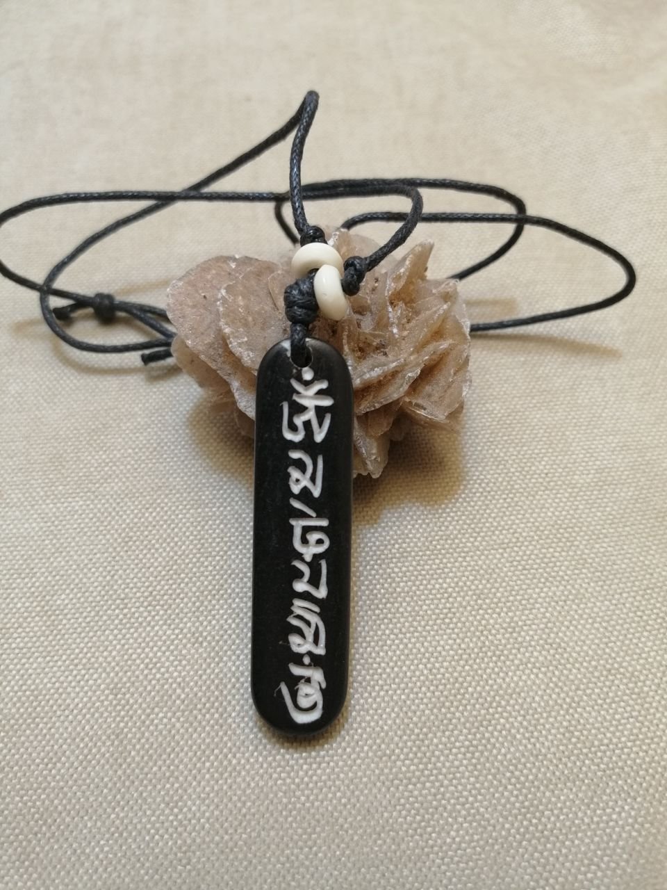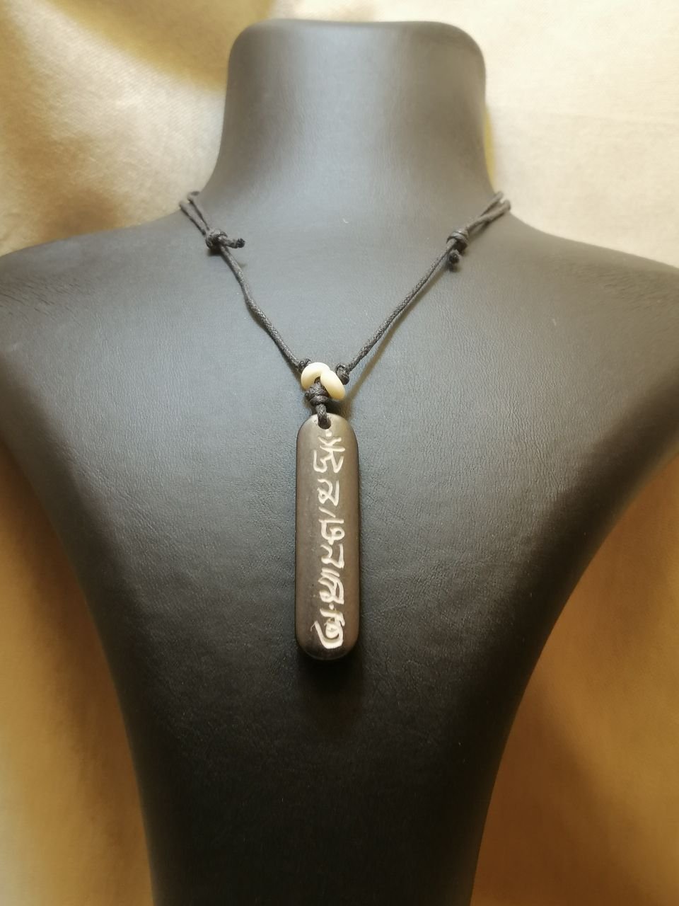 El yapımı oyma öküz kemiği tozu sıkıştırılarak plaka hazırlanıyor ve üzerine yine el işçiliği ile OM MAINI PADME HUM mantrası yazılı.