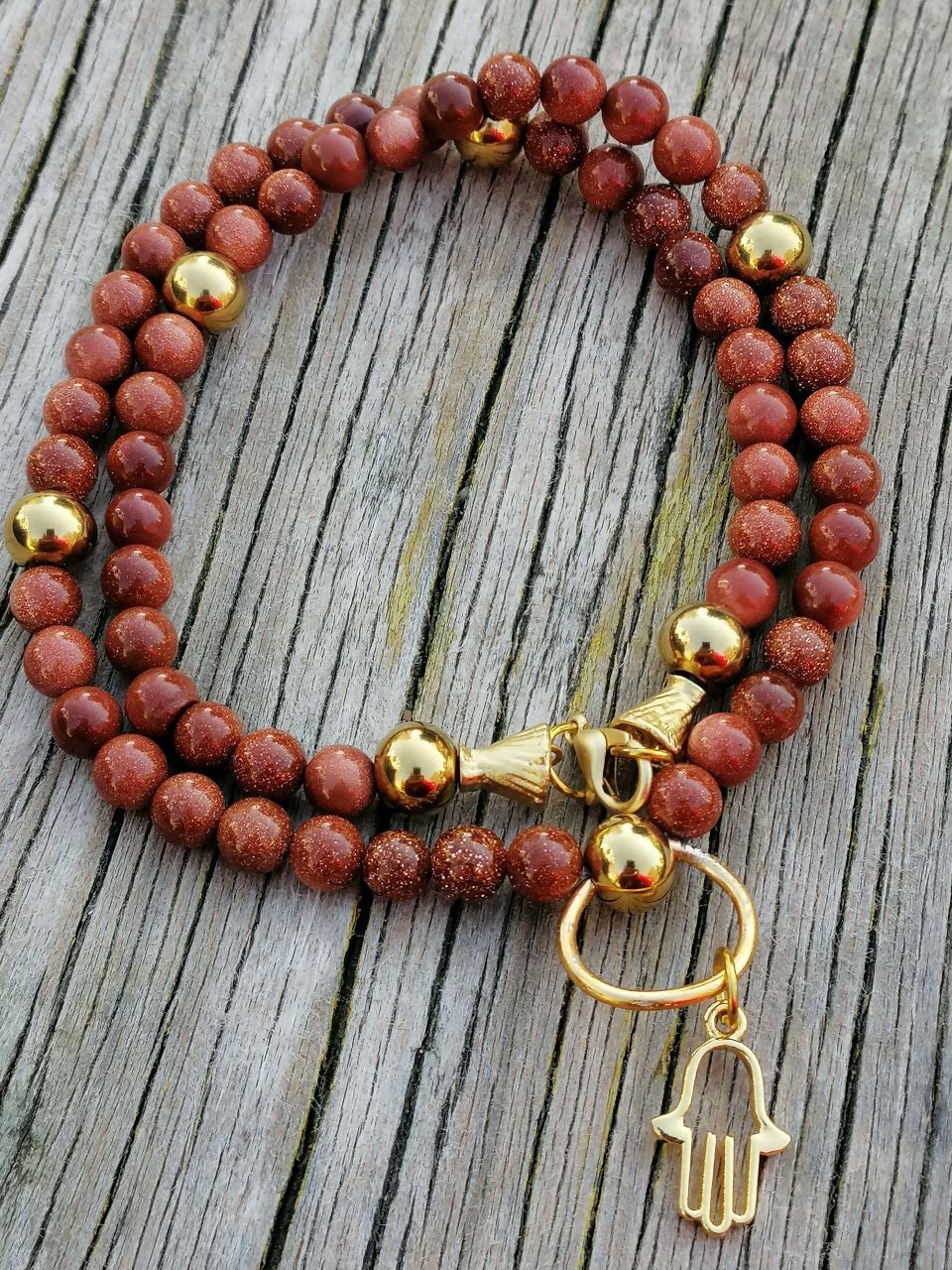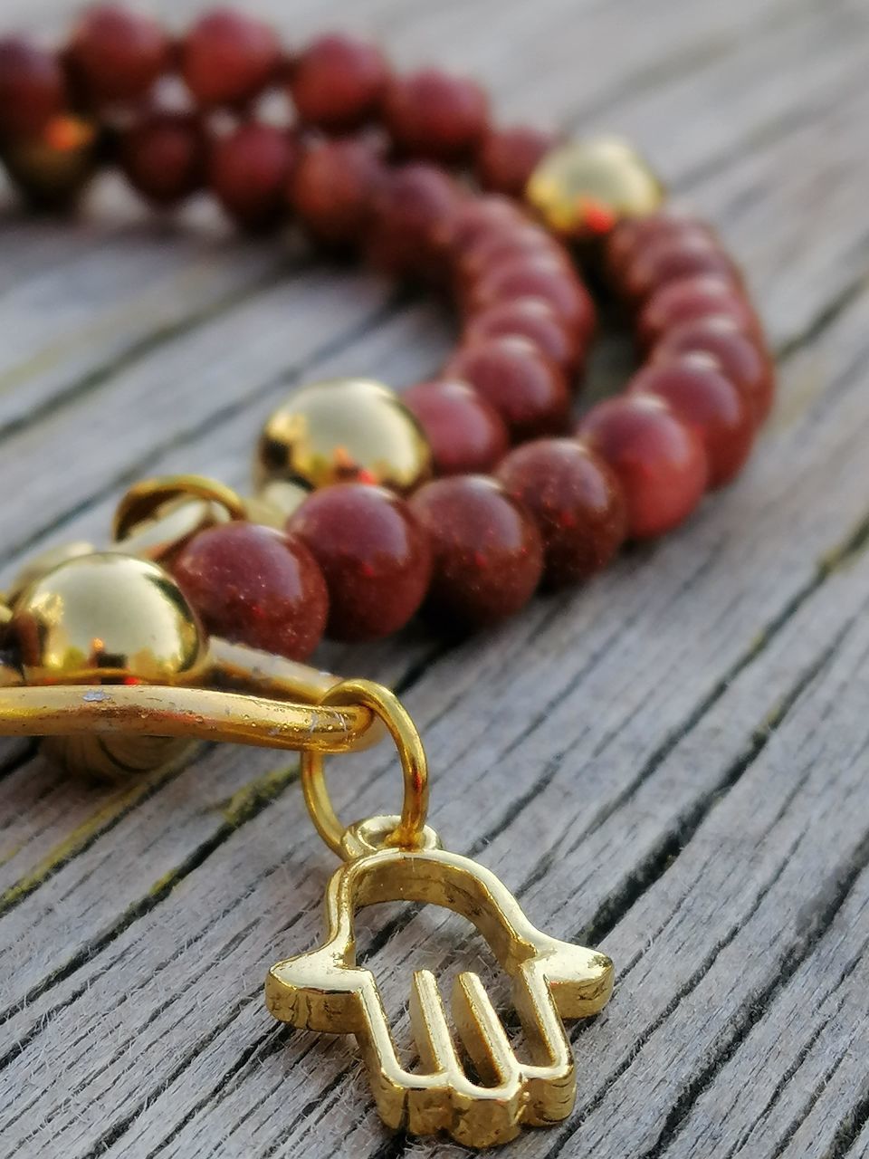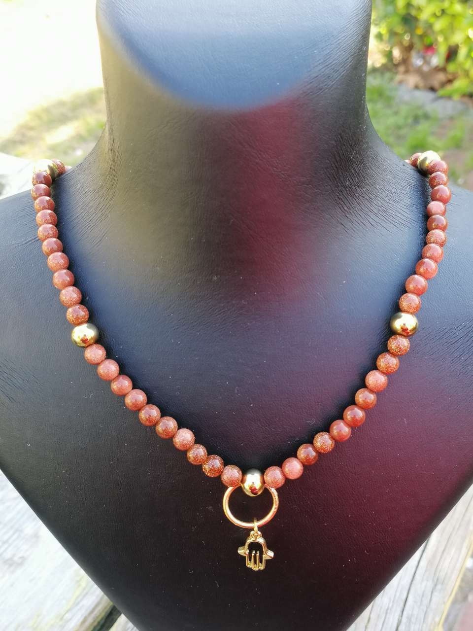 Kolyemiz doğal Güneş taşı ve altın kaplama paslanmaz çelik aparatlar kullanılarak üretilmiştir.