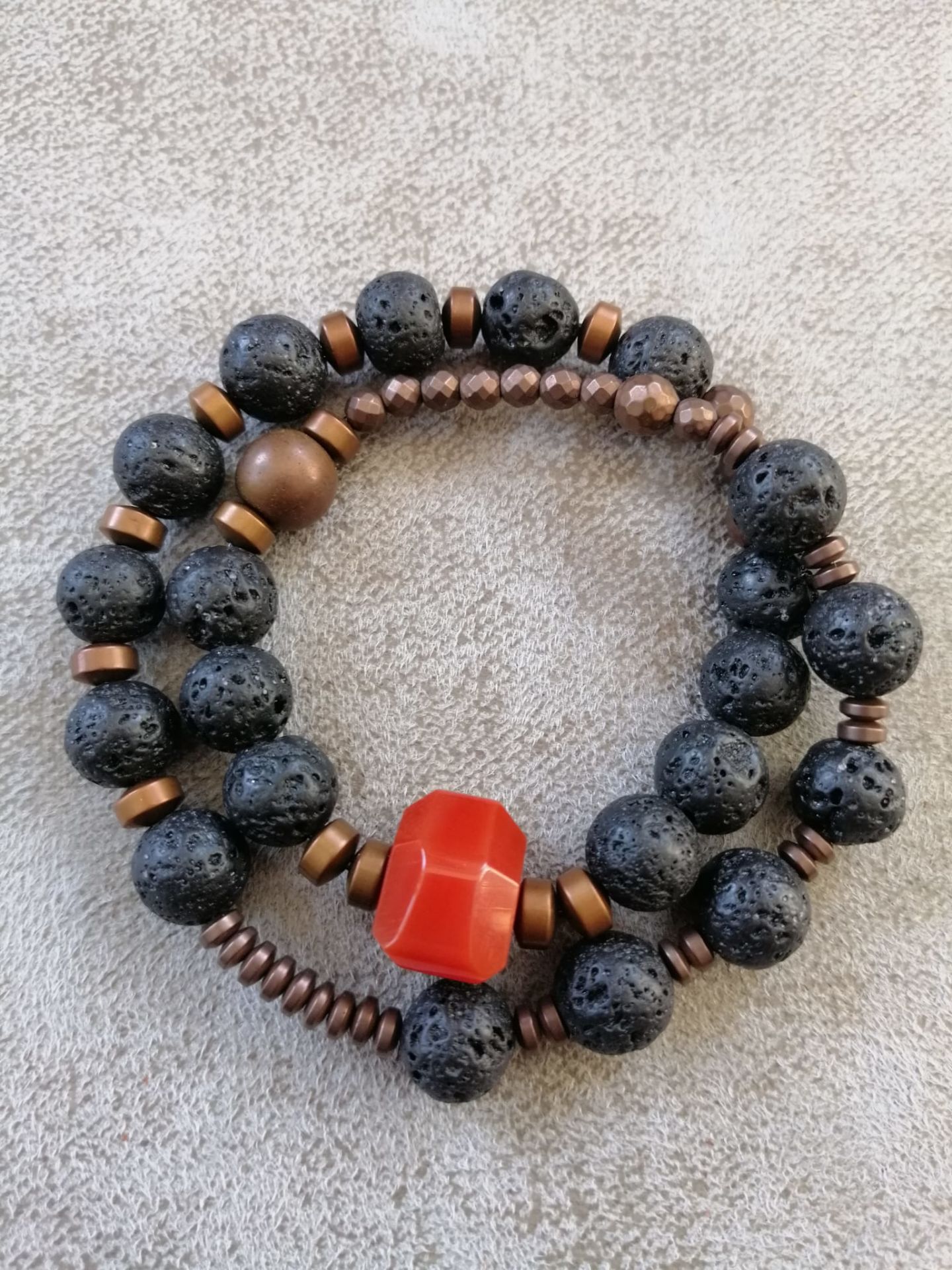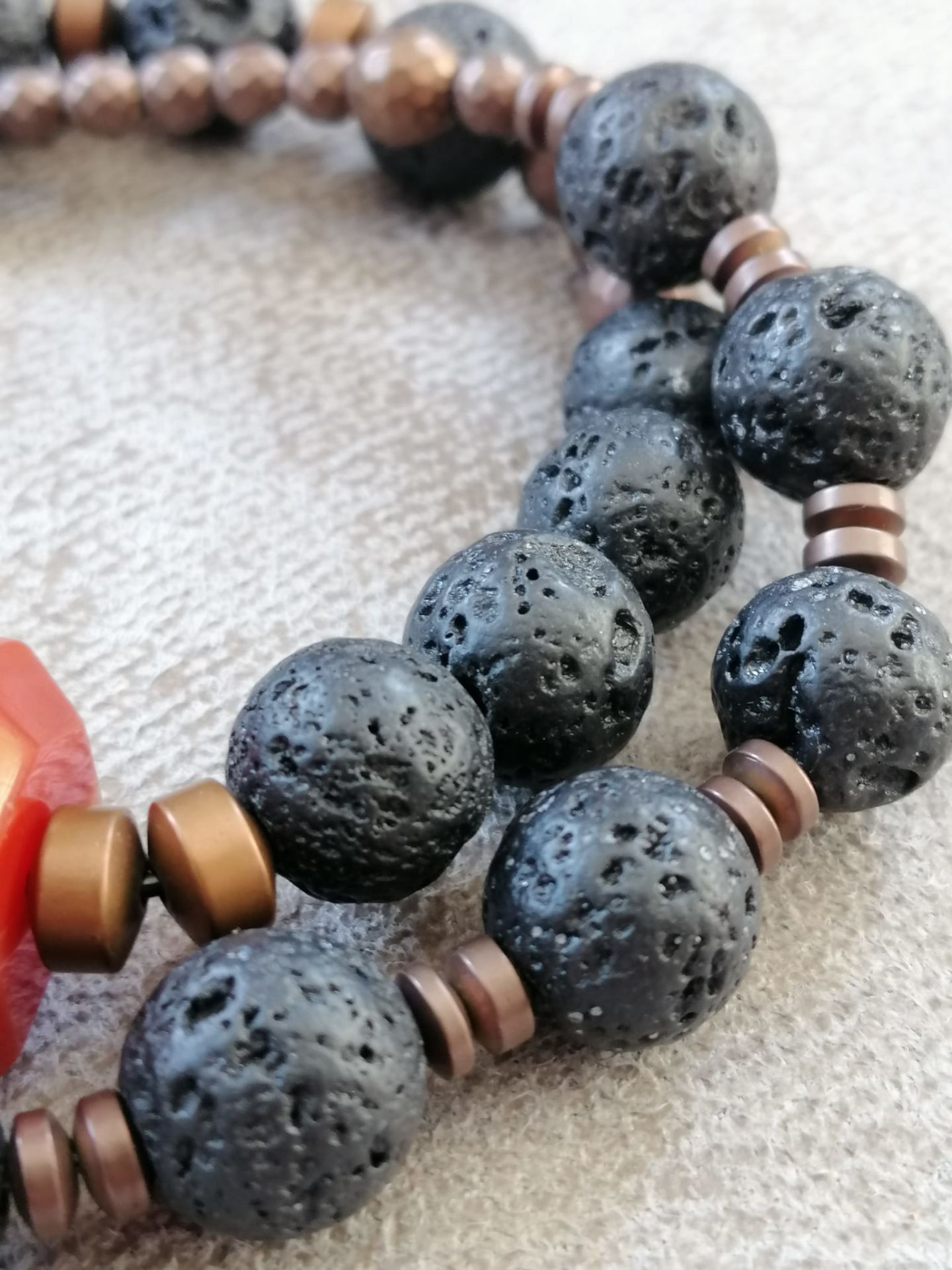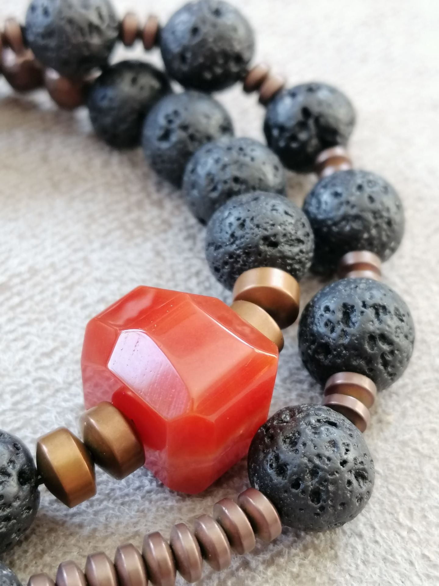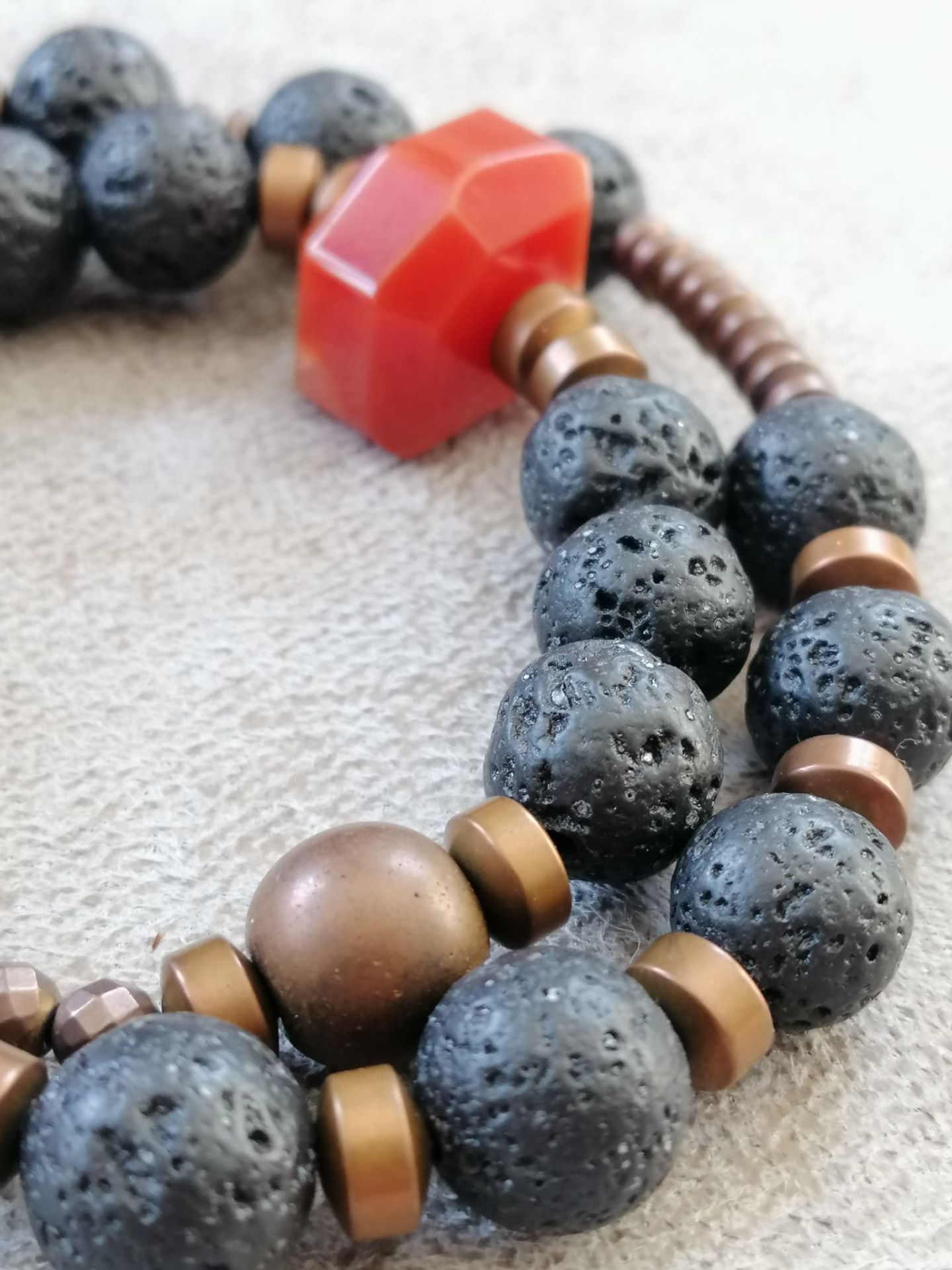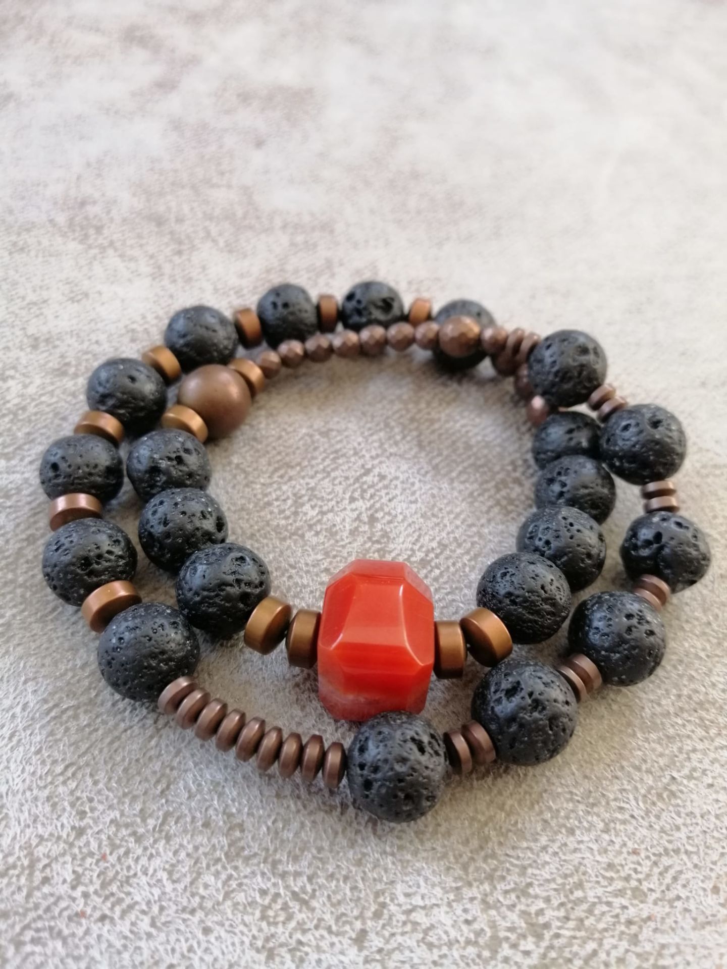 El yapımı, özel tasarım Lav Taşı, Akik ve hematitin güçleri birleştirilerek güçlü ve şık bir bileklik tasarladık. Para ve Bolluk Bereket Bilekliği.