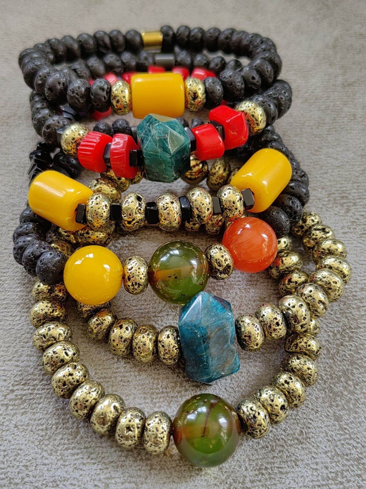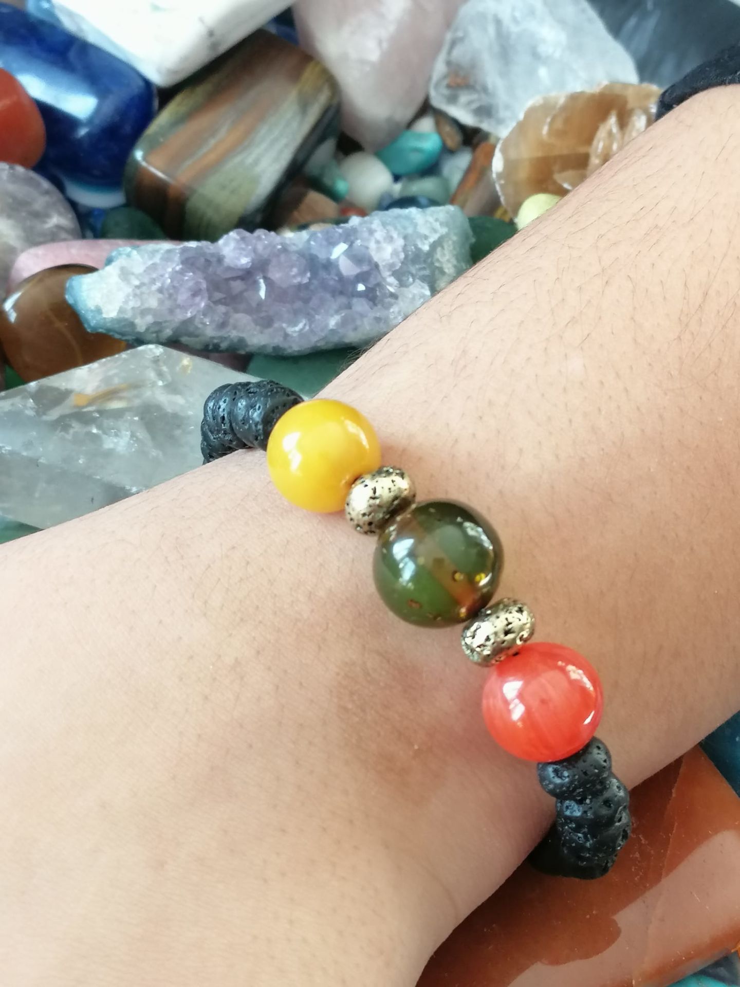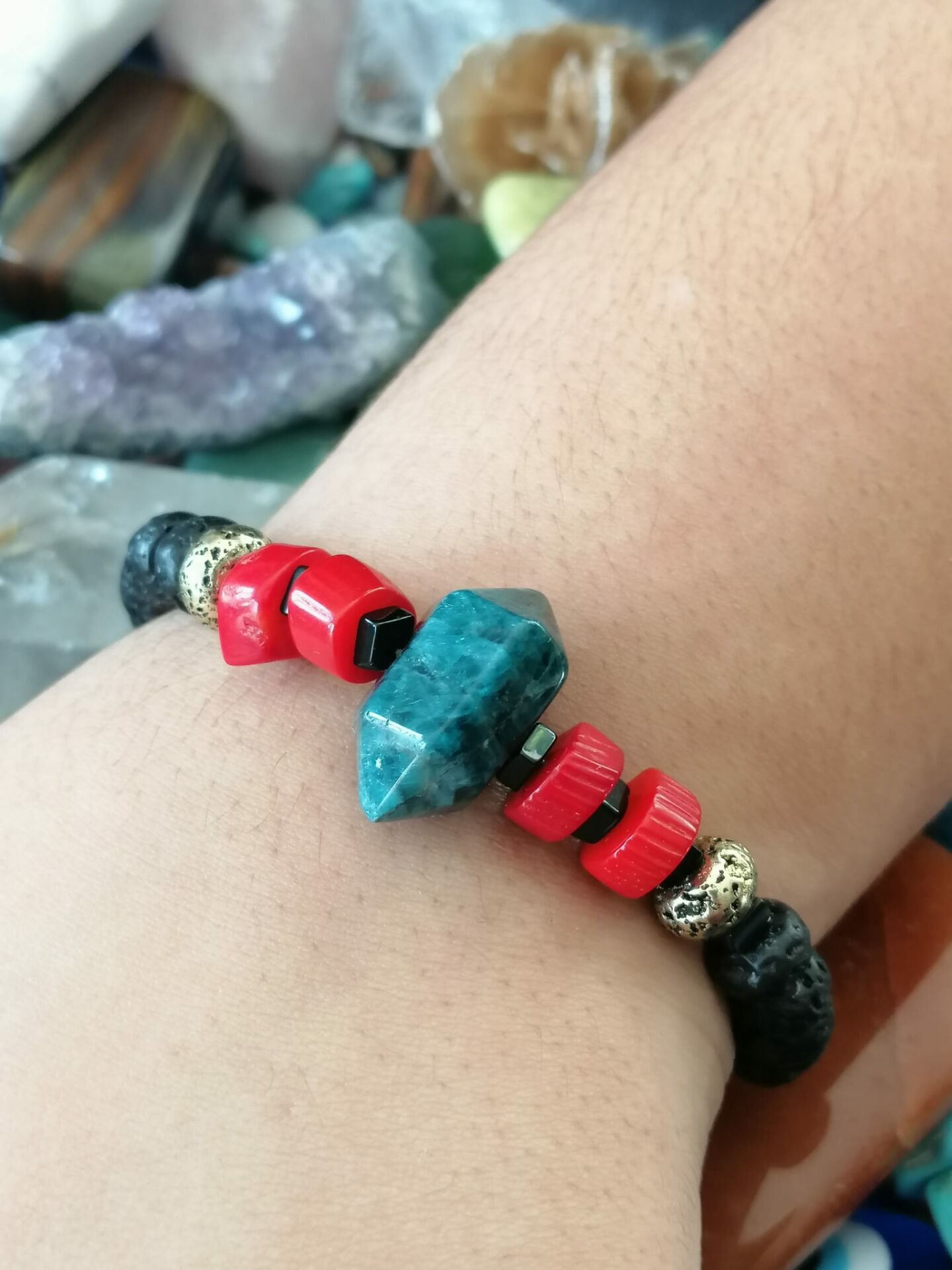 El yapımı, özel tasarım Lav Taşı, Oniks, Mercan, Apatit ve hematitin güçleri birleştirilerek güçlü, şık ve tarz bir bileklik tasarladık. Hem şifa, hem şıklık tamamlayıcınız..
