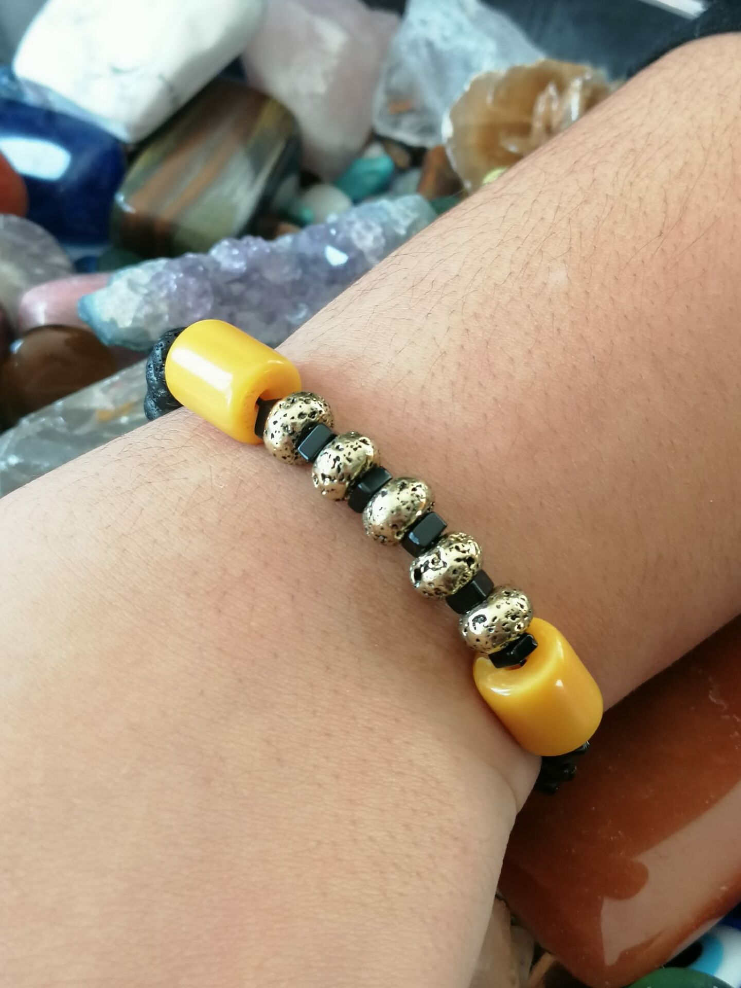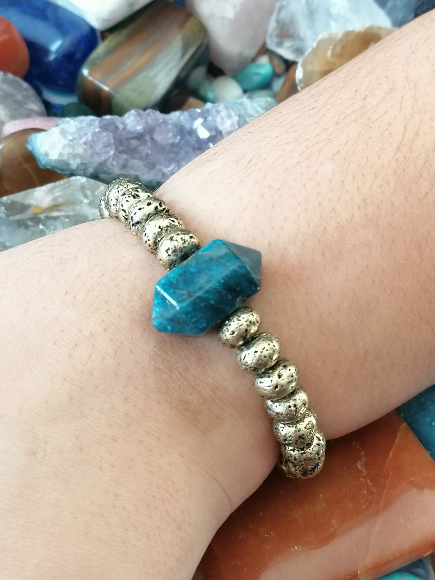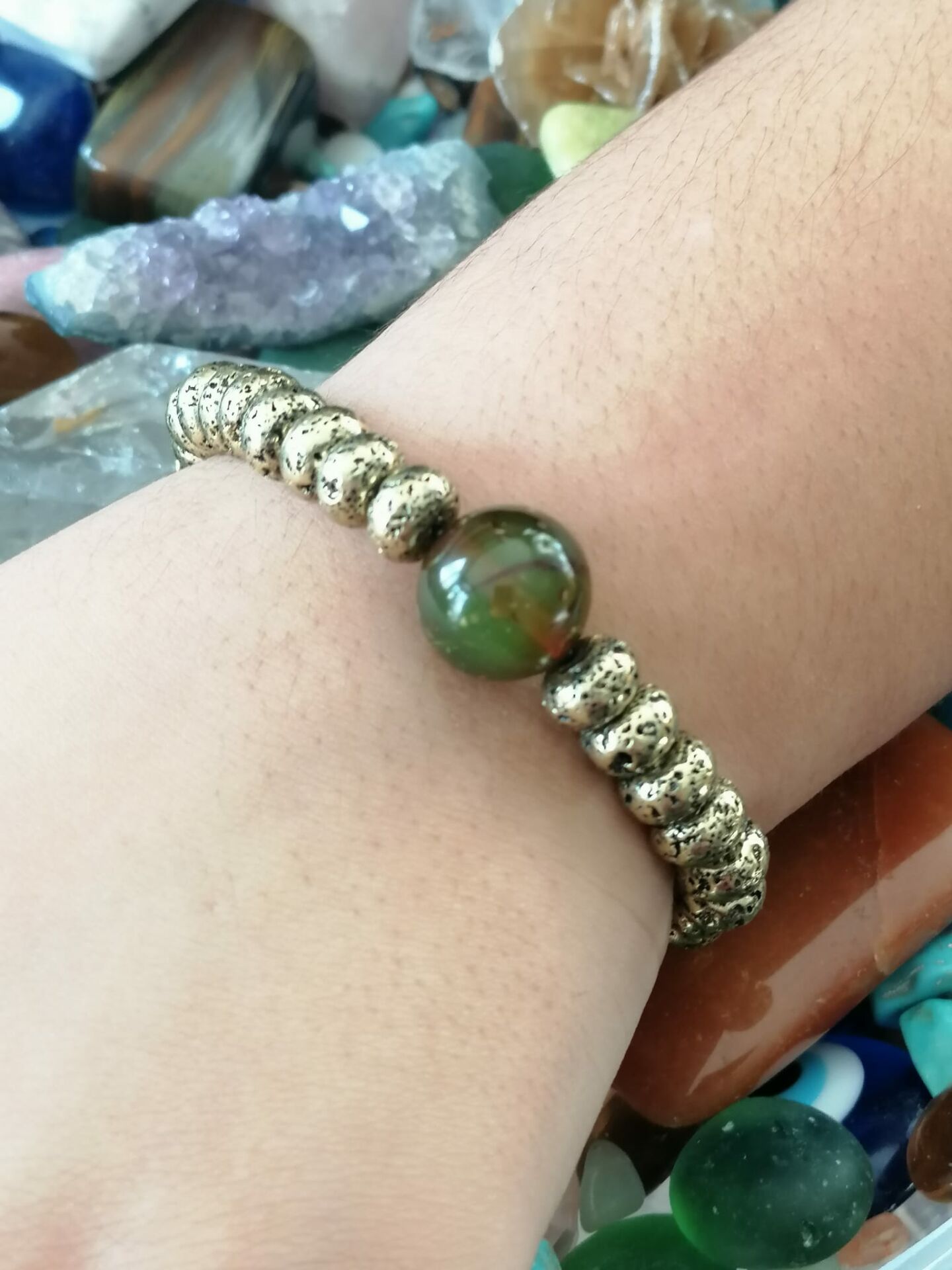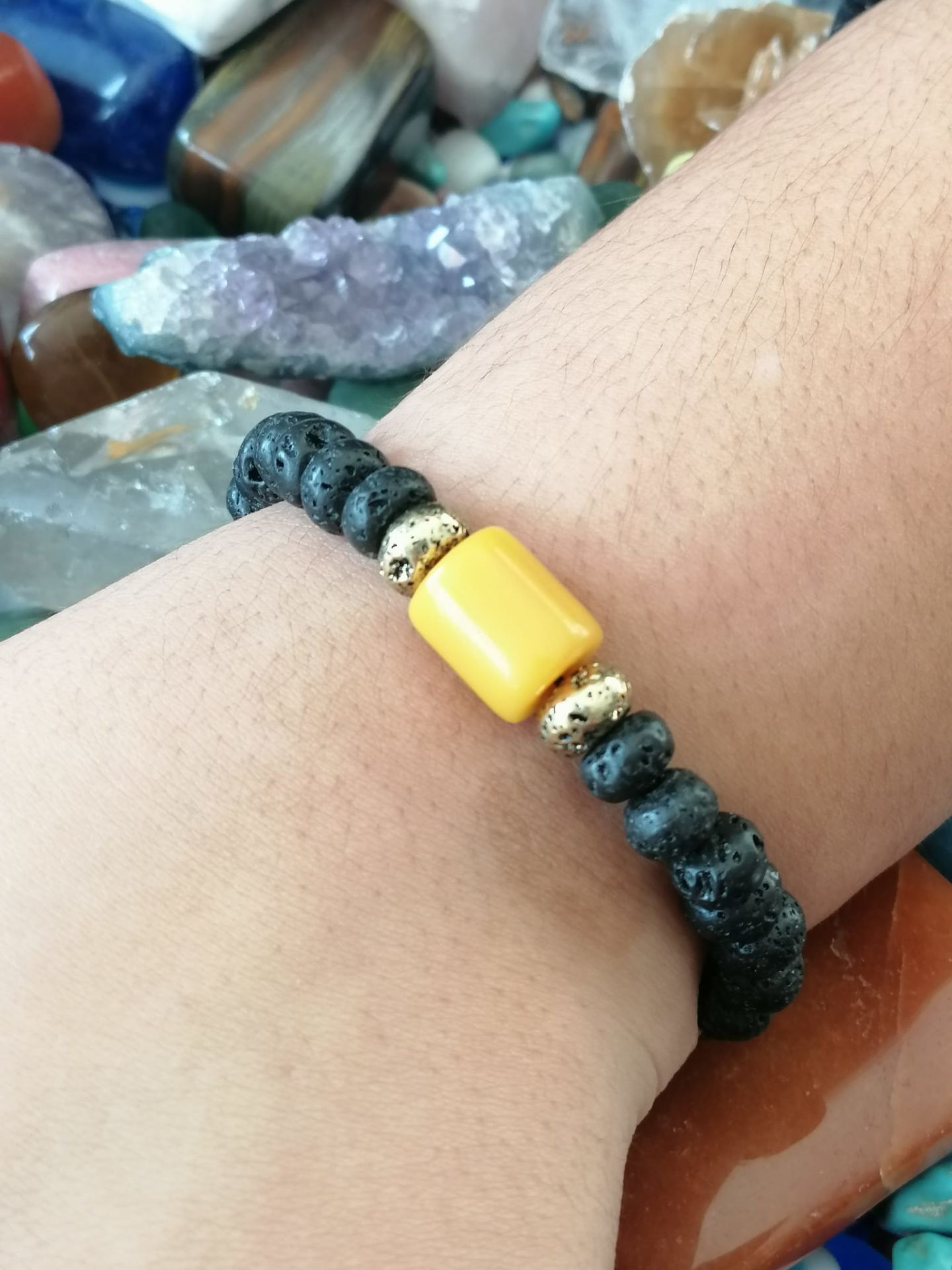 El yapımı, özel tasarım Lav Taşı, Oniks, Mercan, Apatit ve hematitin güçleri birleştirilerek güçlü, şık ve tarz bir bileklik tasarladık. Hem şifa, hem şıklık tamamlayıcınız..