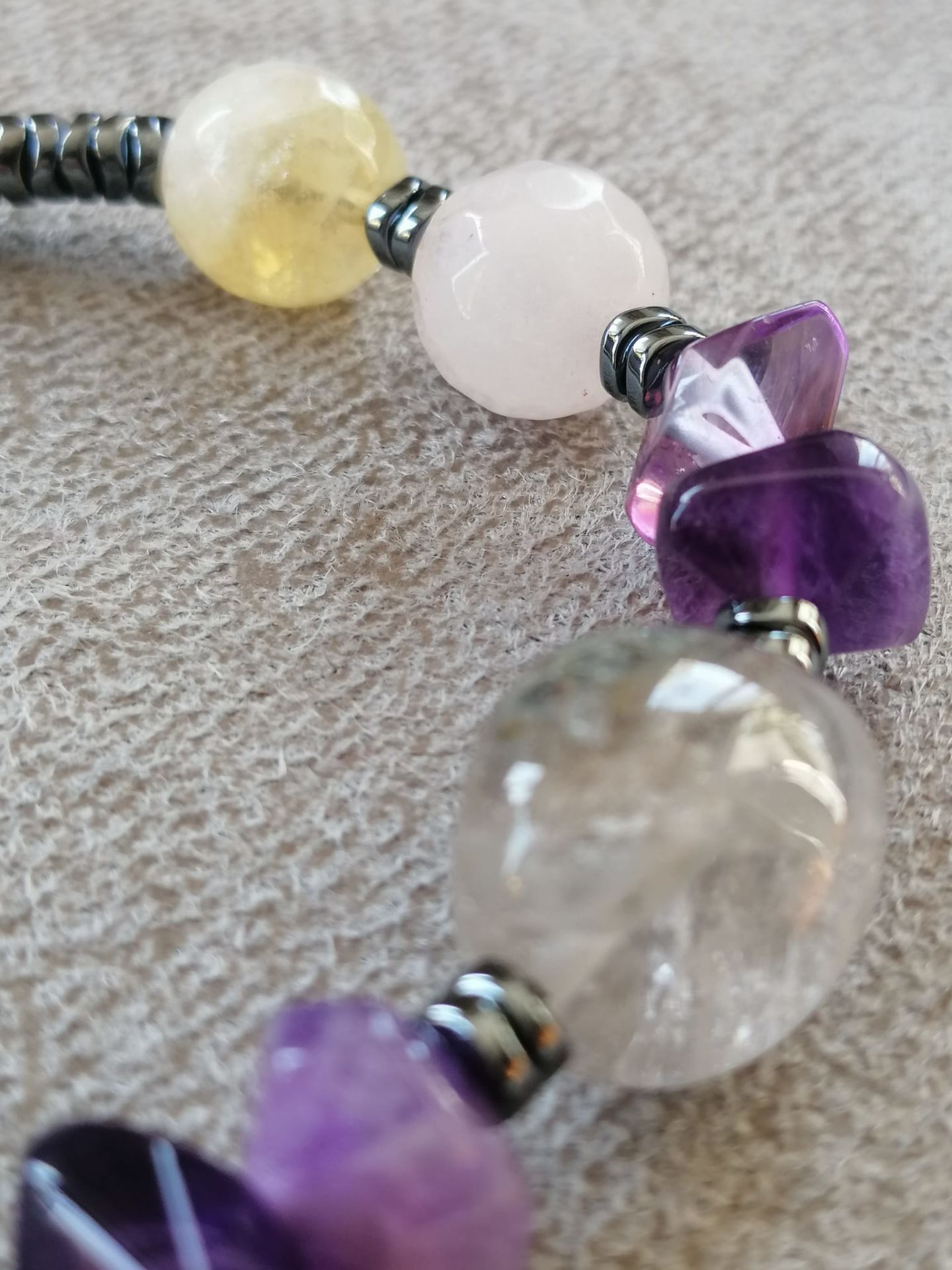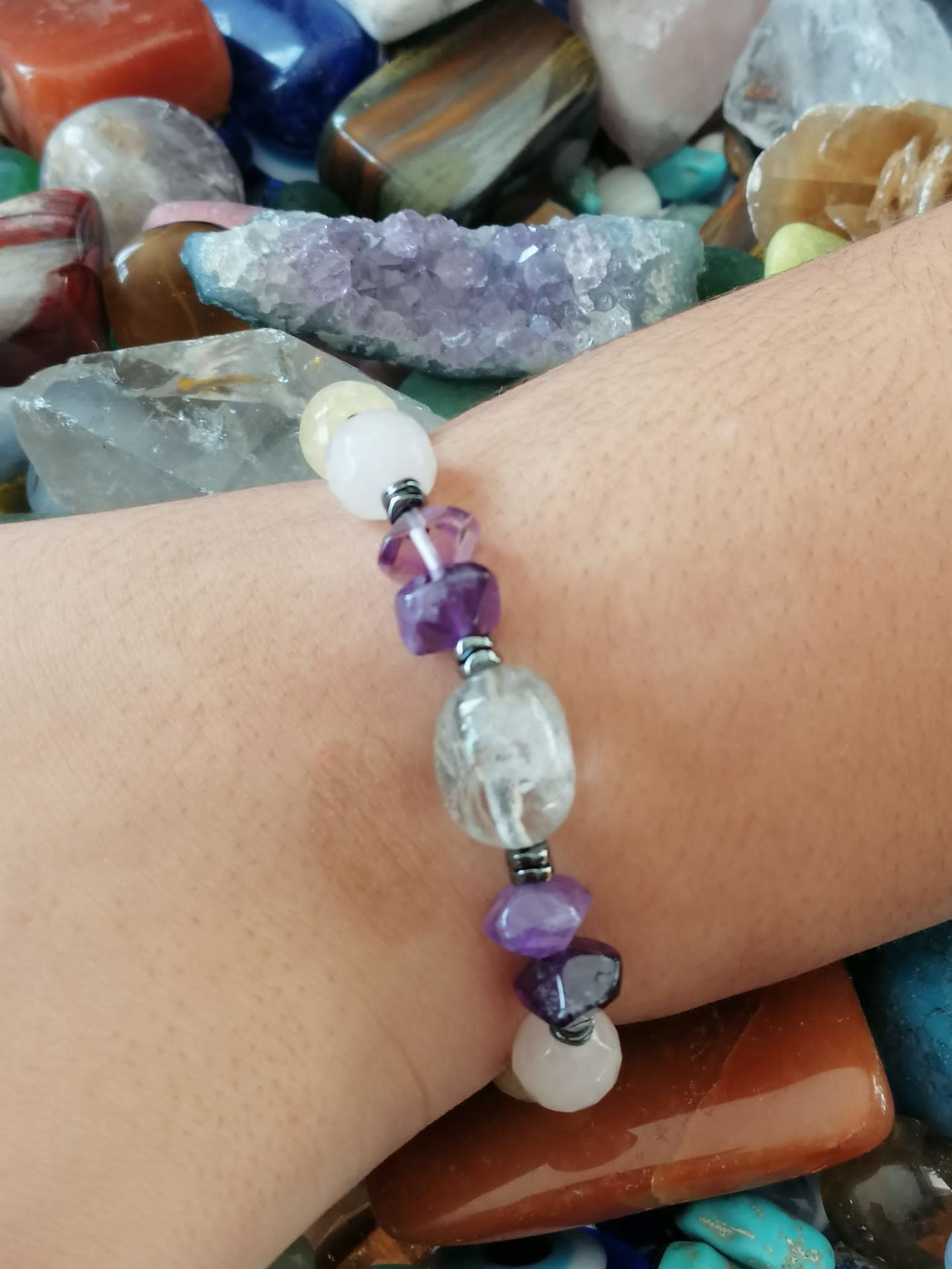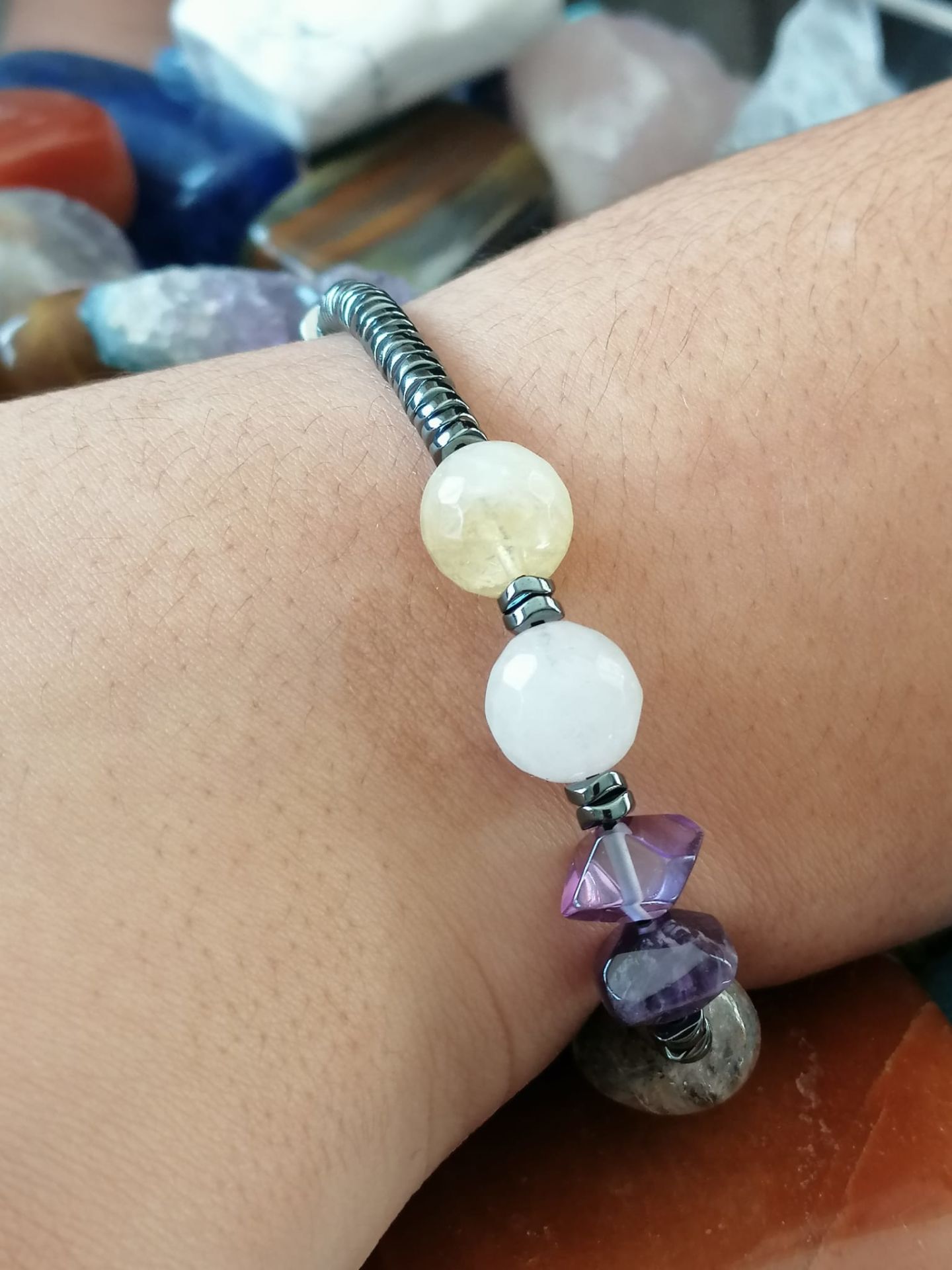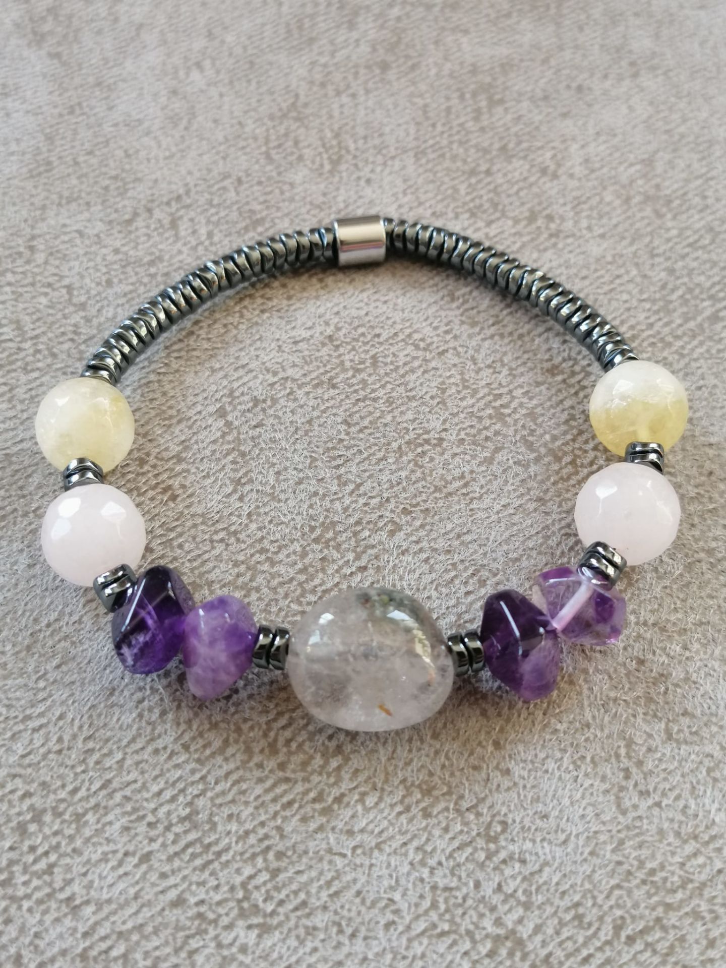 El yapımı, özel tasarım Ametist, Kristal Kuvars ve hematitin güçleri birleştirilerek güçlü ve çok şık bileklikler tasarladık.