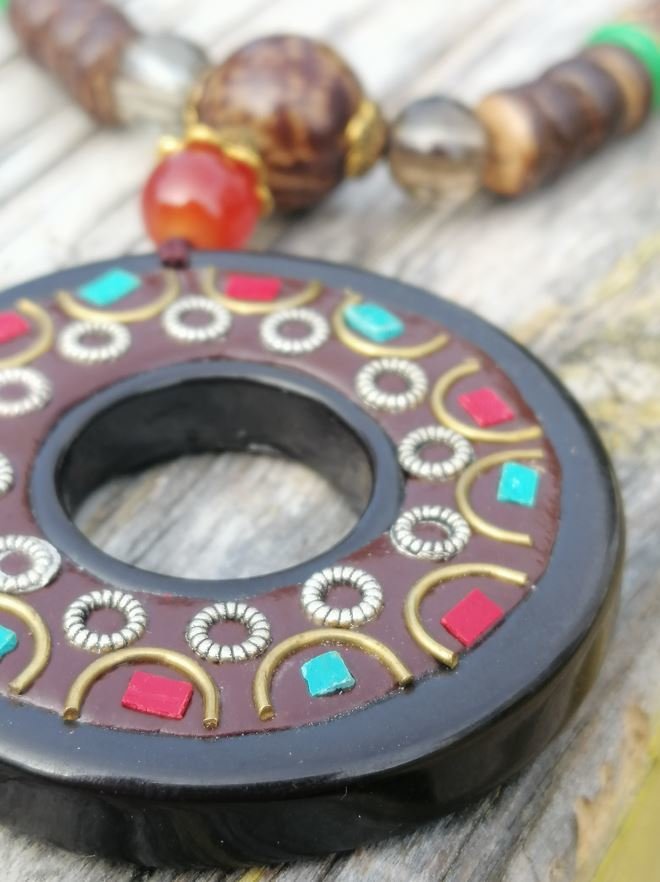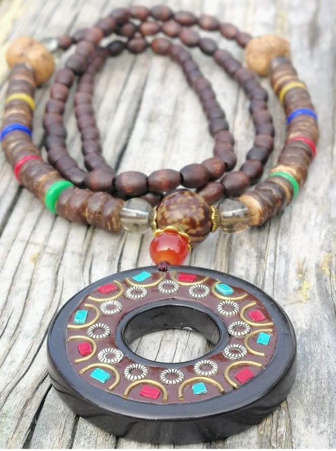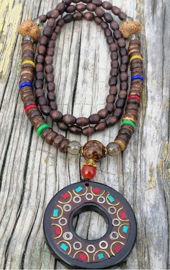 Doğal Taş Süslemeli Ahşap Uzun Mala Kolye