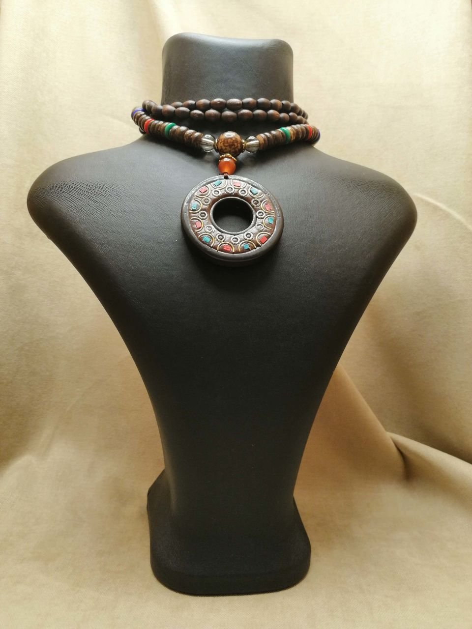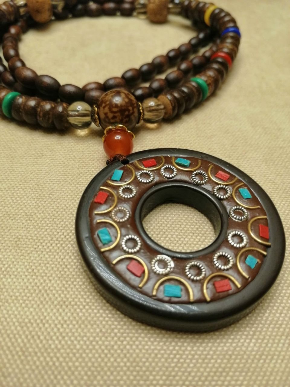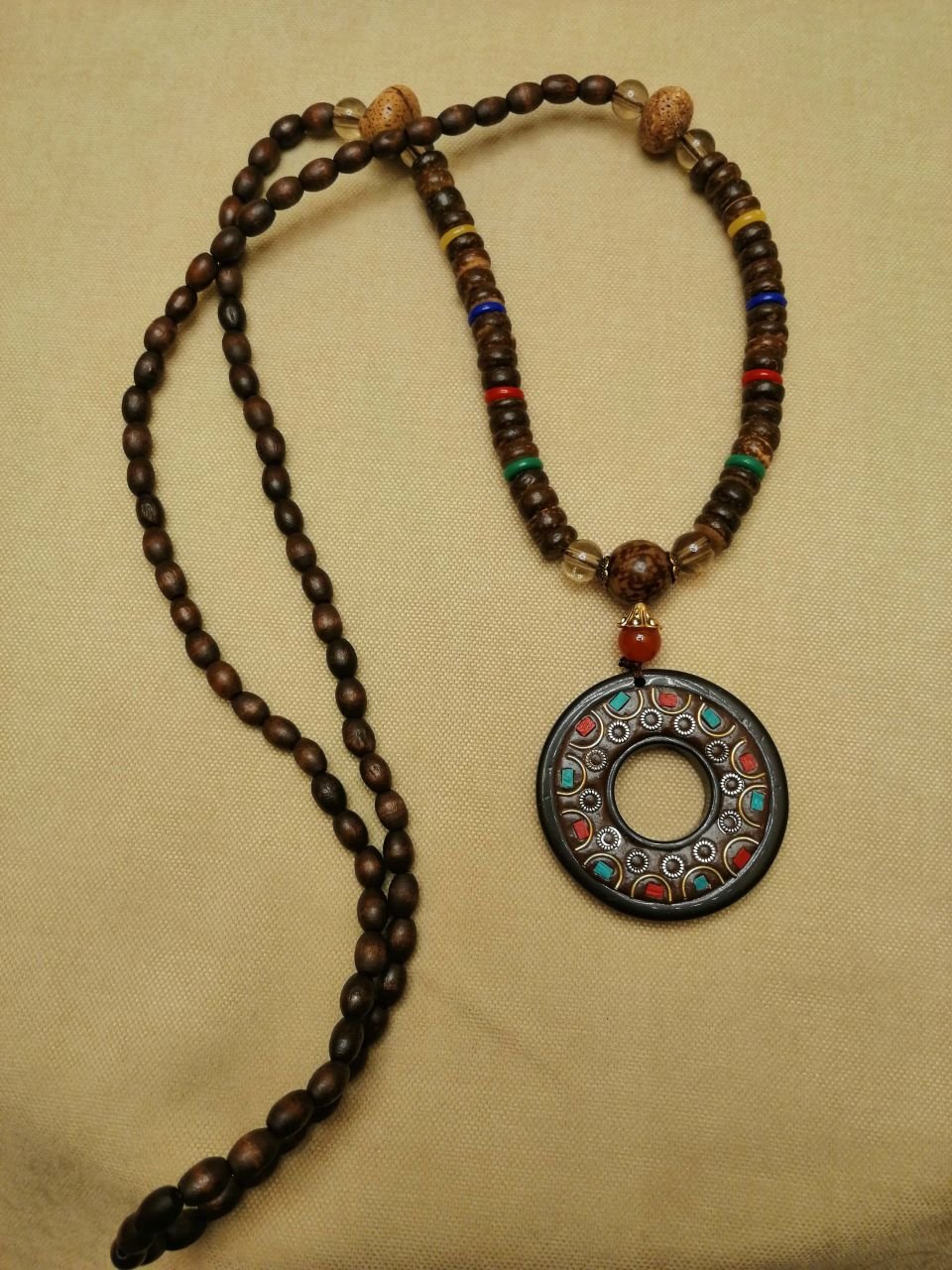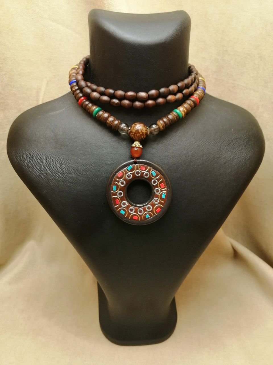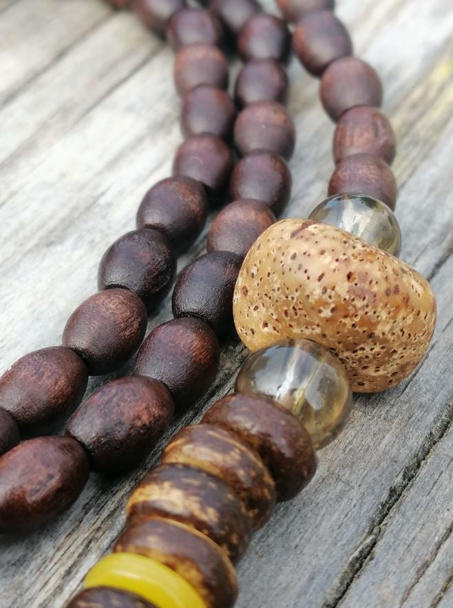 Kışın kazaklarla rahatlıkla ve zevkle kullanılabilecek ahşap boncuk uzun mala kolye.