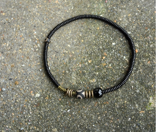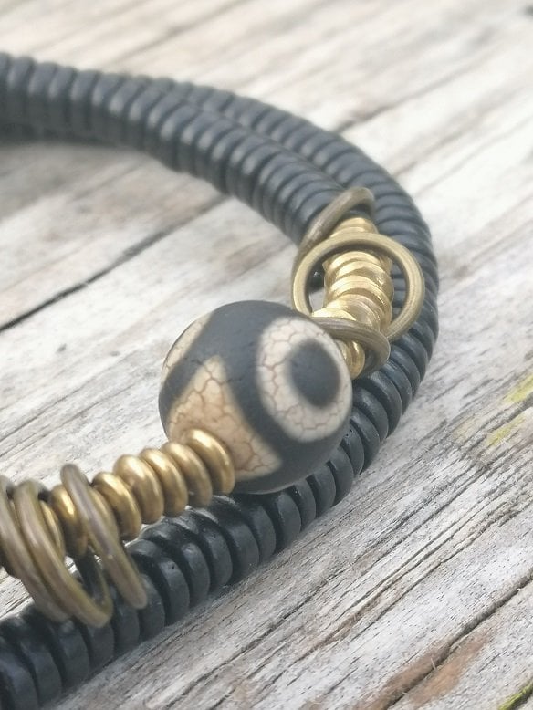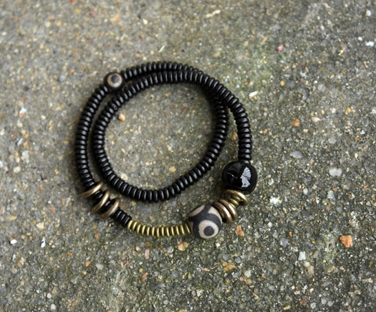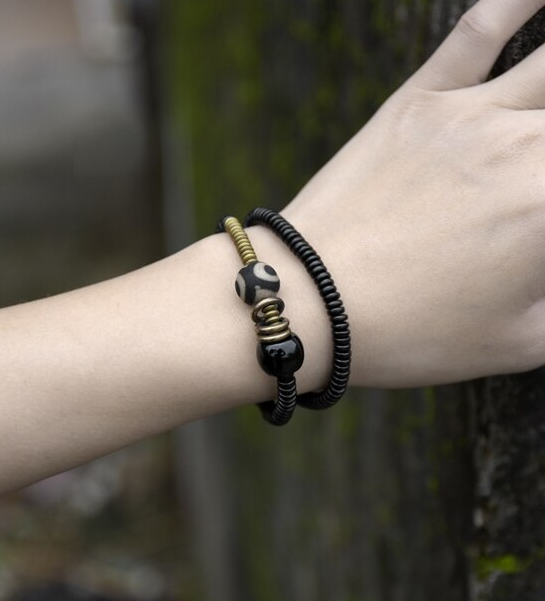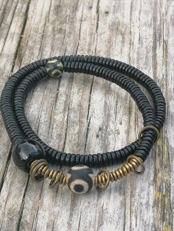 Bakır Siyah oniks abanoz ağacı boncuğundan üretilmiş etnik meditasyon bilekliği.
