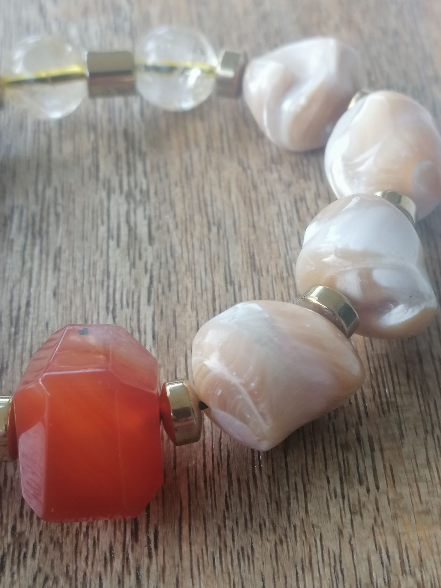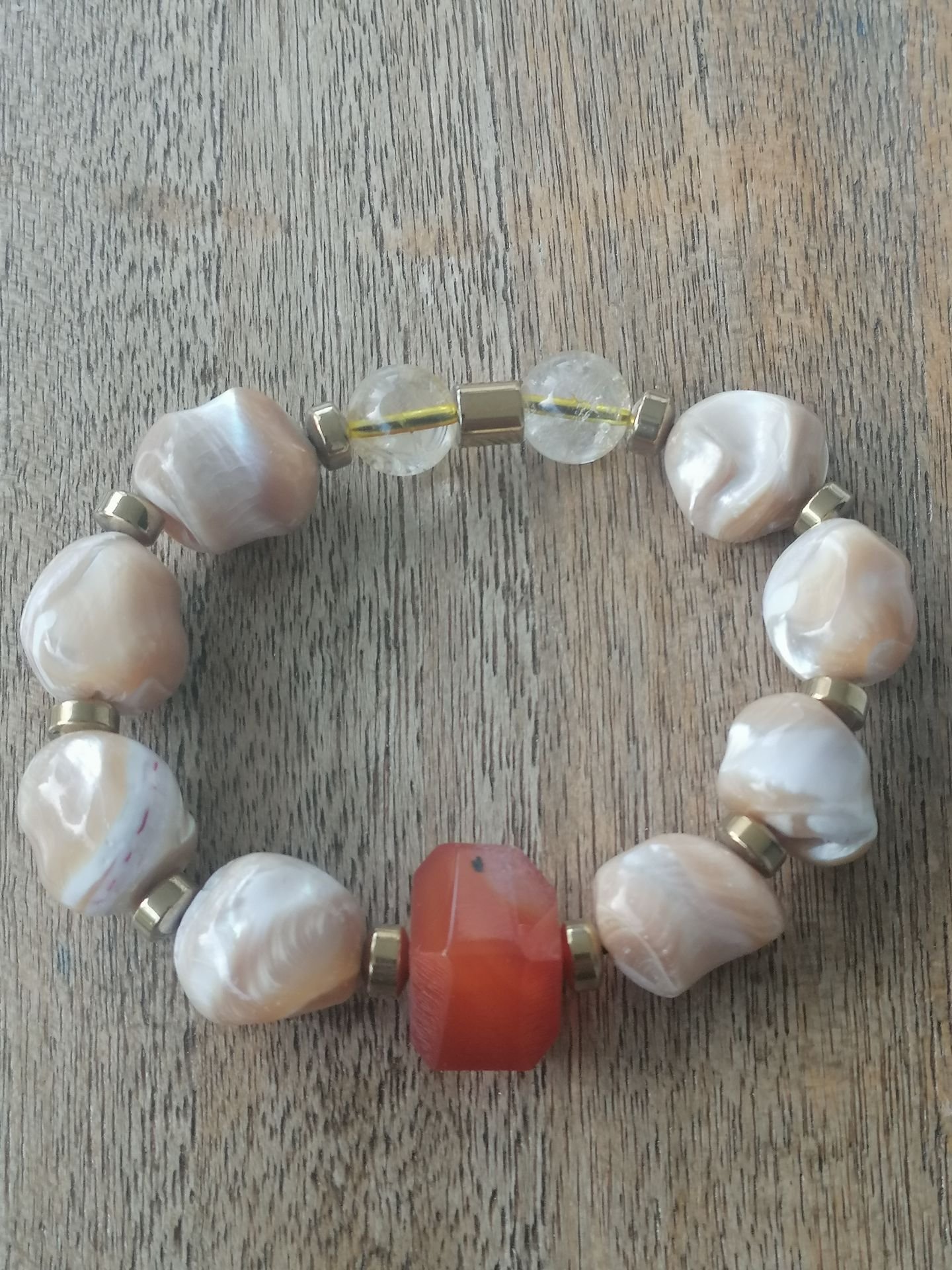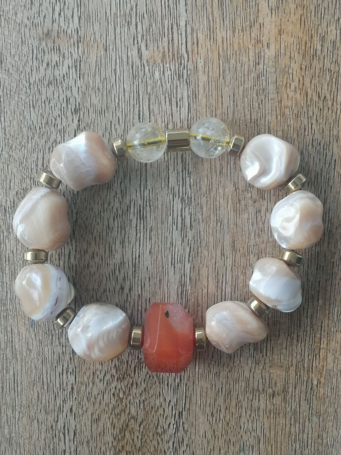 El yapımı, özel tasarım Sitrin, Akik, Sedef ve hematitin güçleri birleştirilerek güçlü ve şık bir bileklik tasarladık. Para Arınma, güçlendirme, görünürlüğü artırma, dişil enerji gibi ana başlıklara ilaveten aşağıdaki detaylarda destek alabileceğiniz bir bileklik.