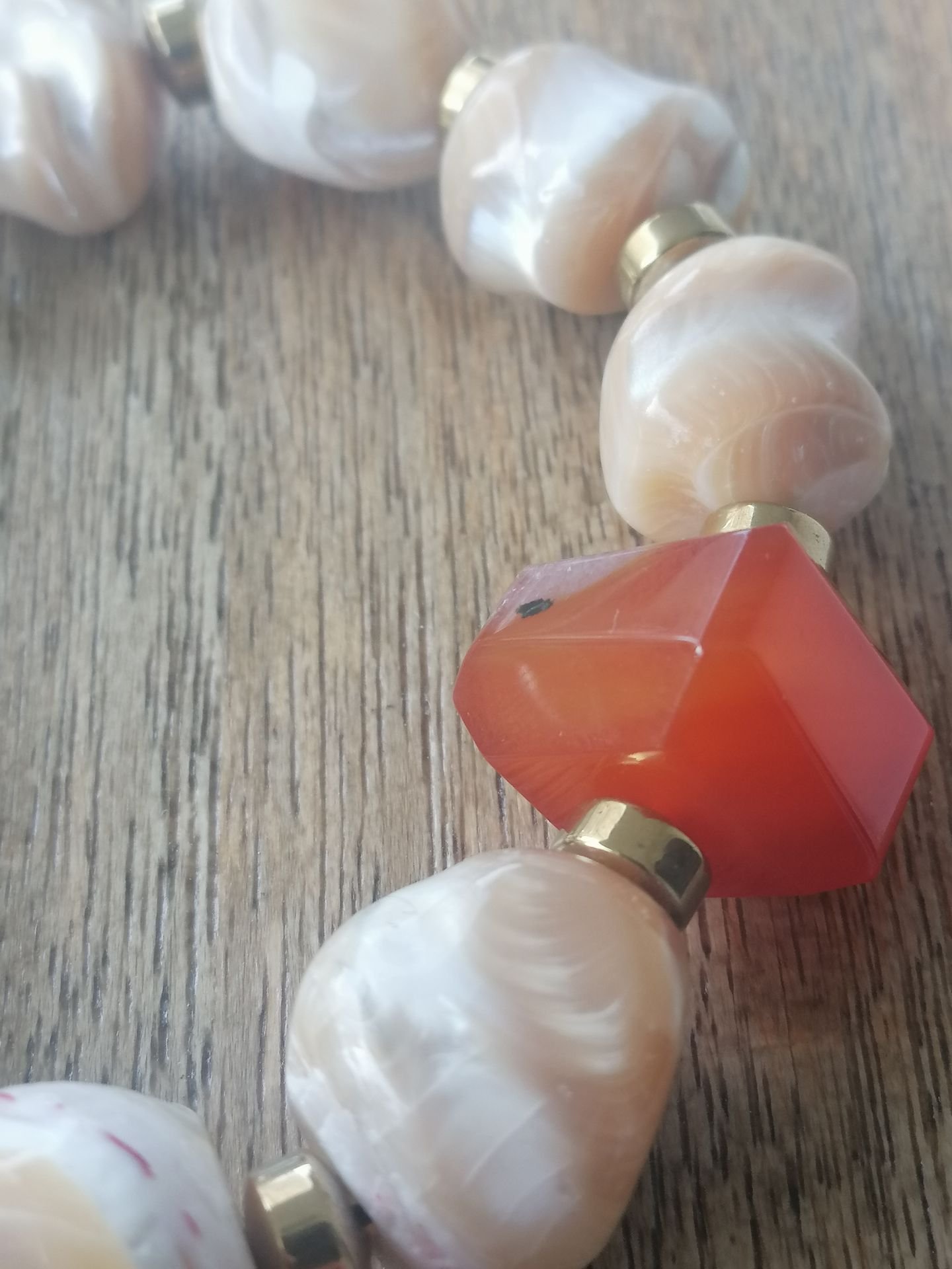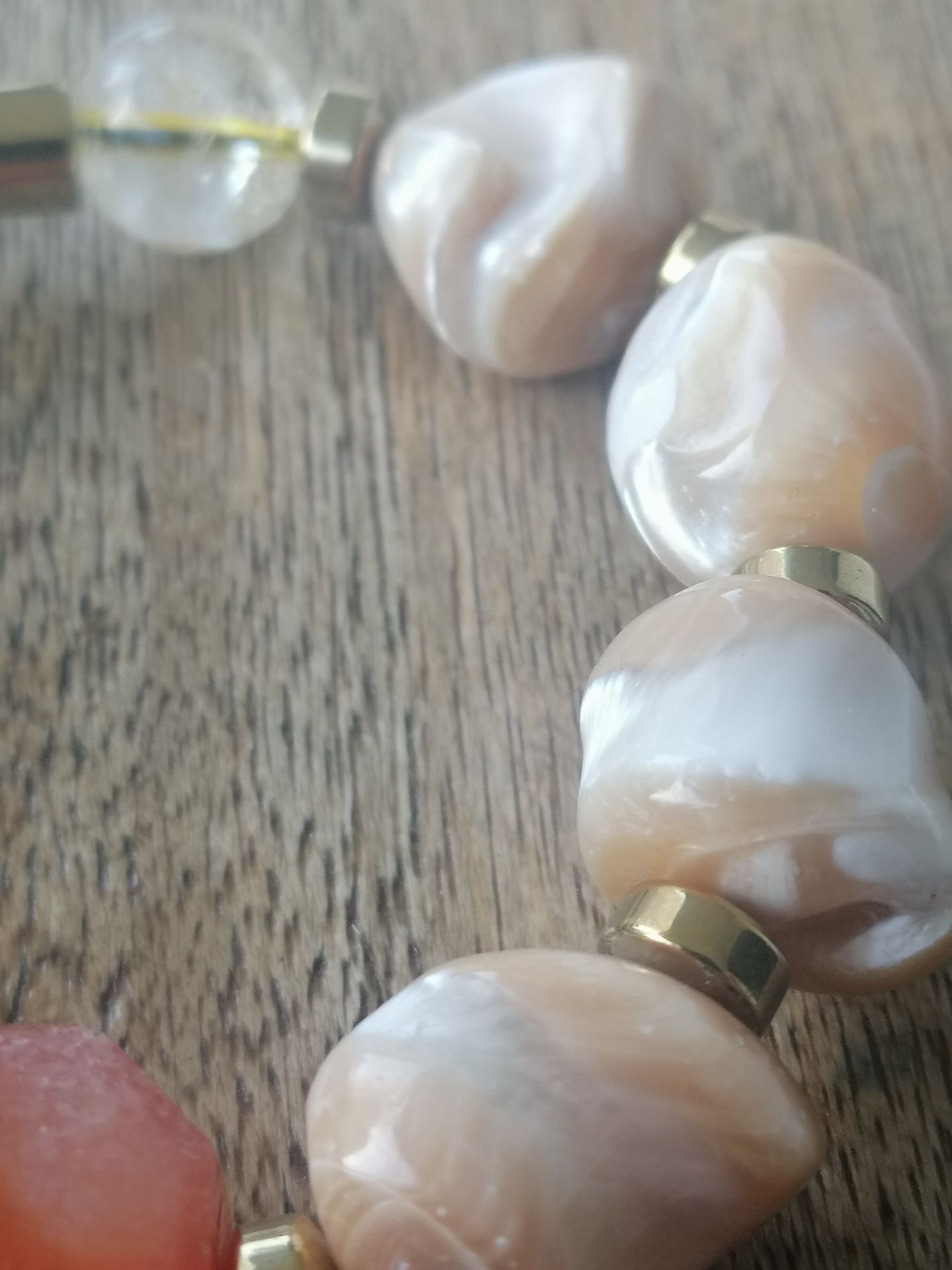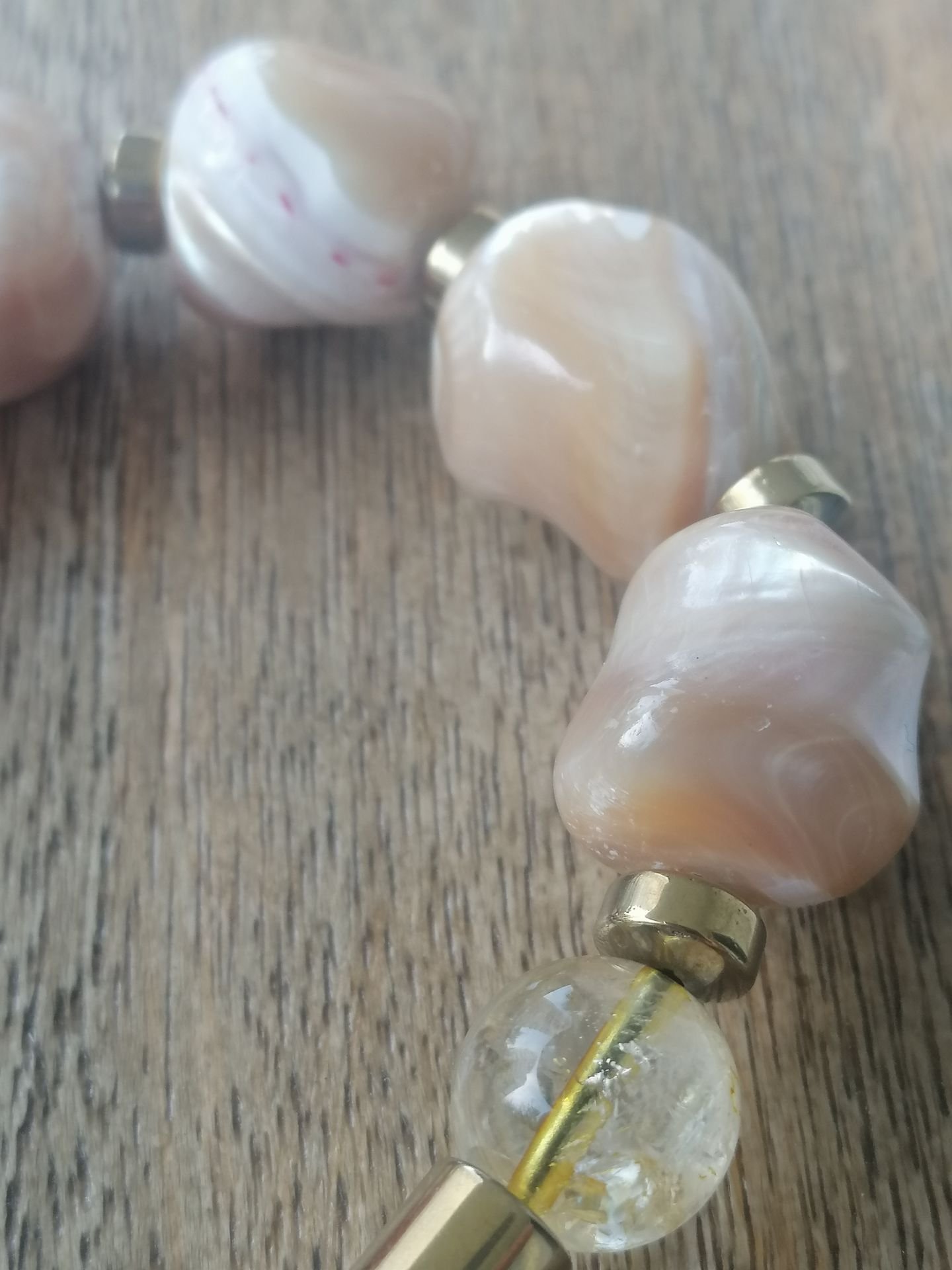El yapımı, özel tasarım Sitrin, Akik, Sedef ve hematitin güçleri birleştirilerek güçlü ve şık bir bileklik tasarladık. Para Arınma, güçlendirme, görünürlüğü artırma, dişil enerji gibi ana başlıklara ilaveten aşağıdaki detaylarda destek alabileceğiniz bir bileklik.